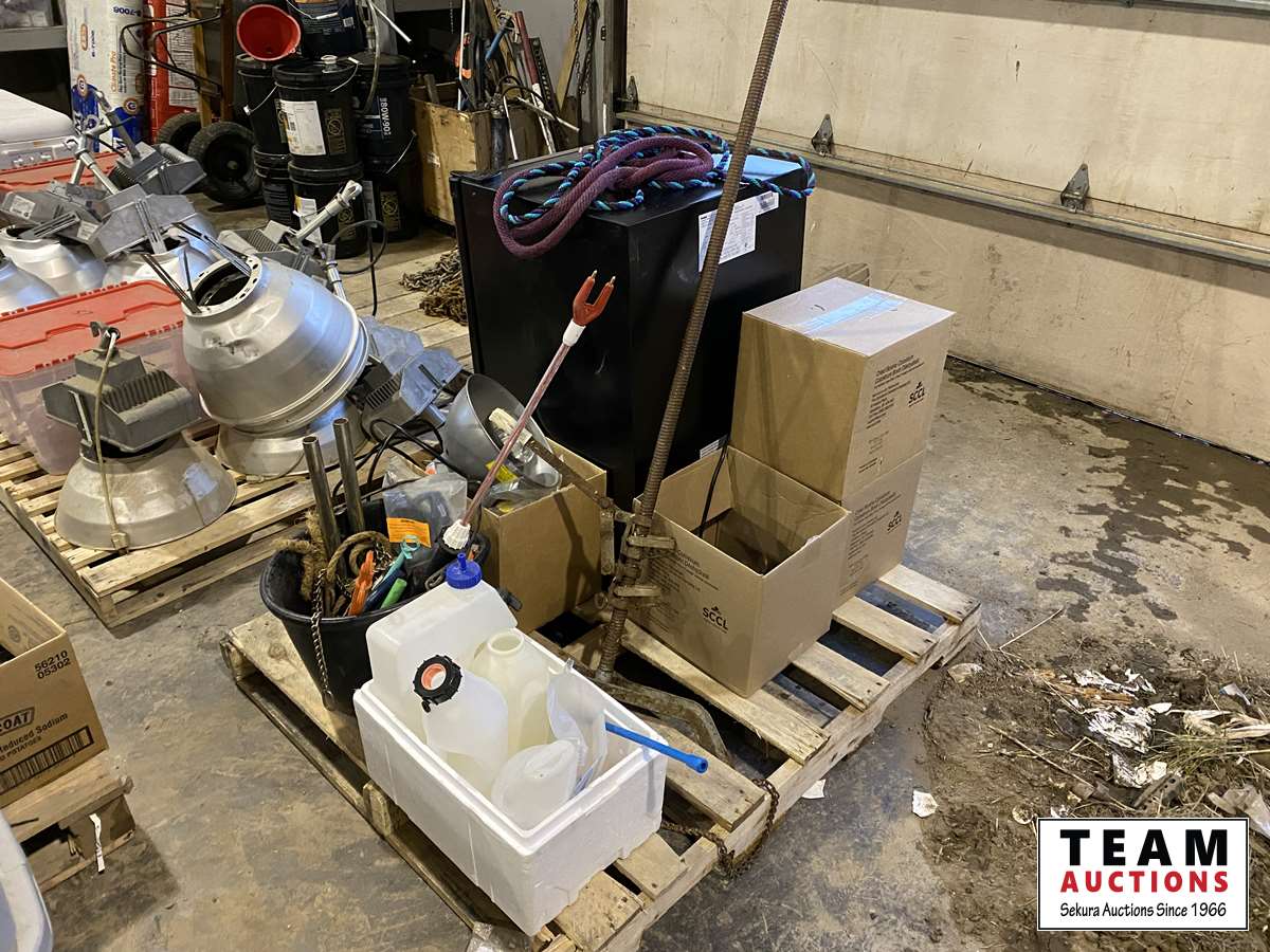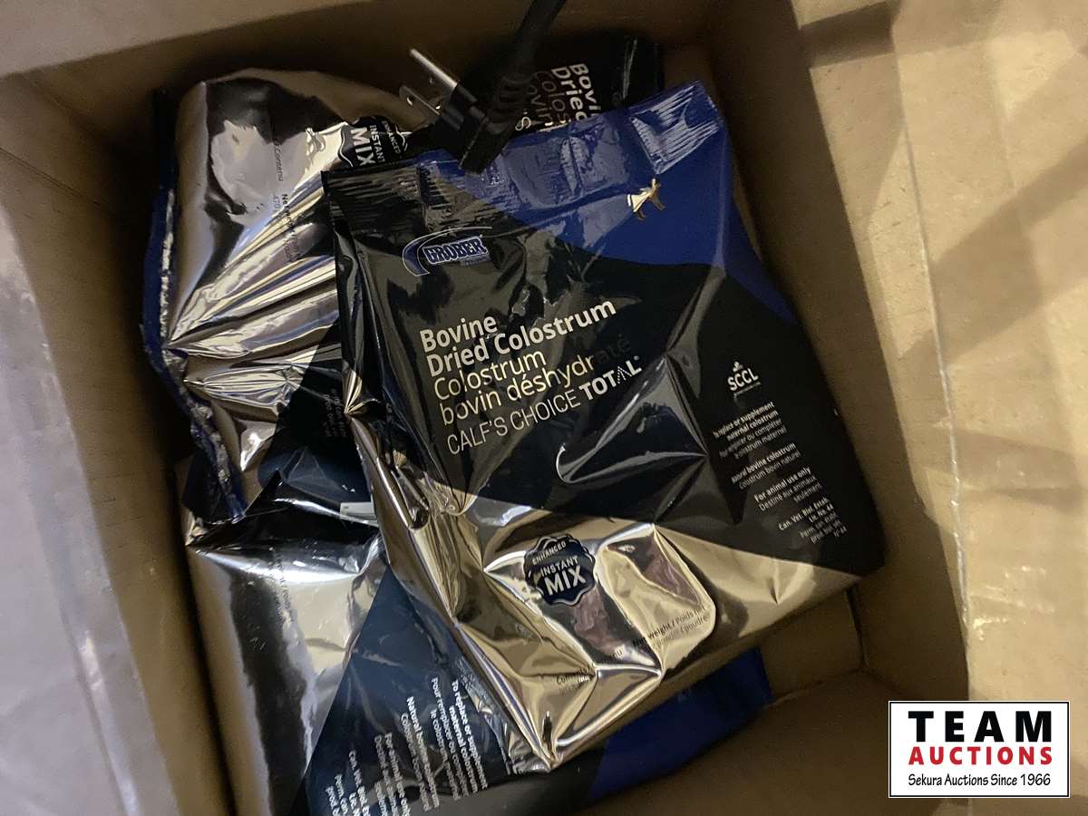 33 bags of Bovine Dried Colostrum, ear tags, cattle prod, tube feeders, cow halters, calf pullers with chains, ear taggers, horn cutters, bottles, heat lamp, fridge