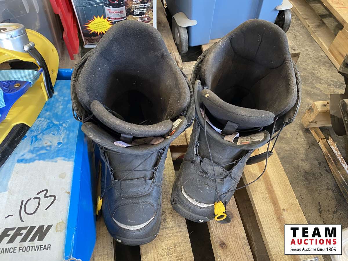 (2) sets of adult snow shoes, Kids snow shoes, Plastic snowboard, Youth snowboard, Mens snowboard boots