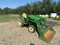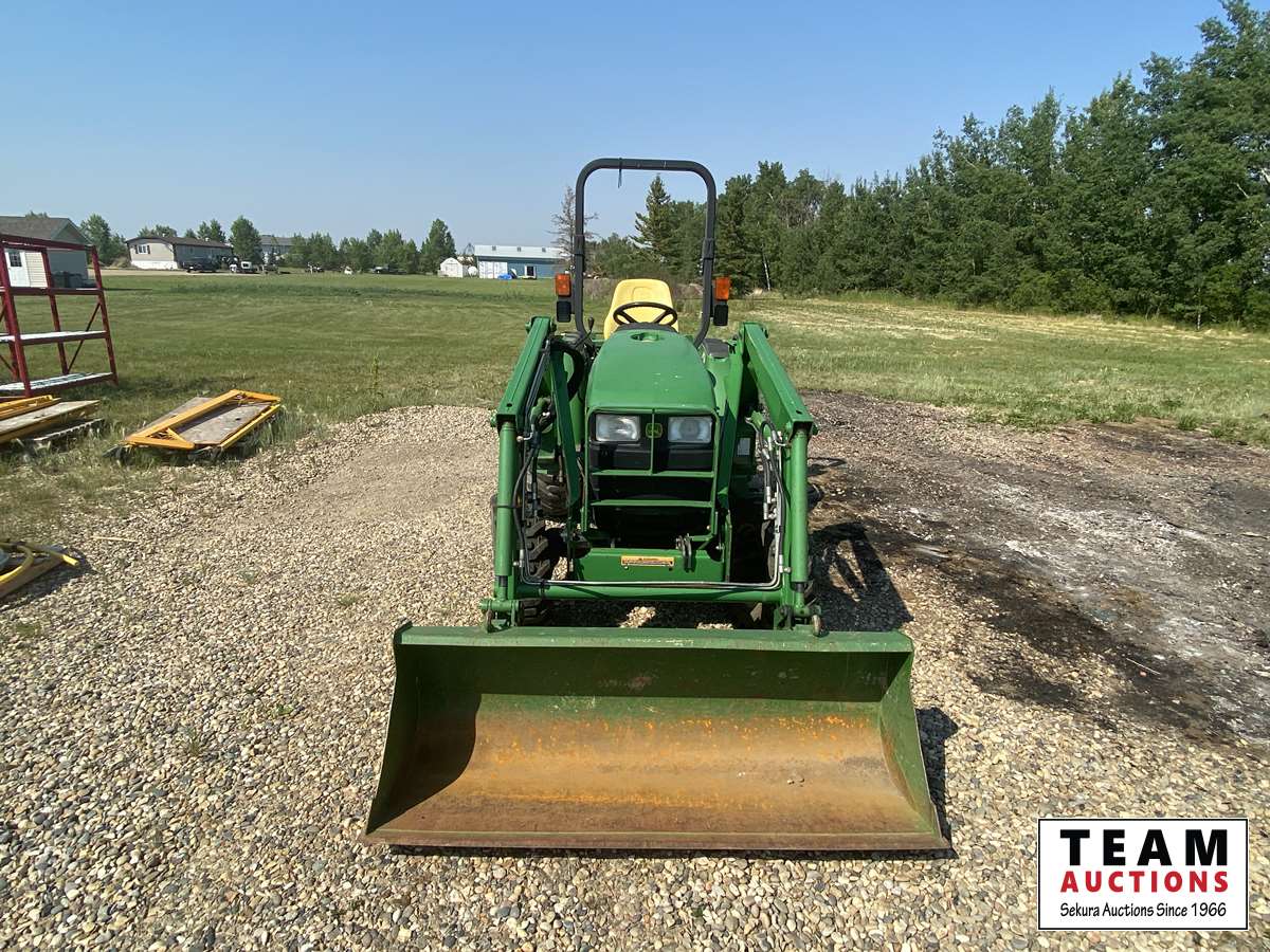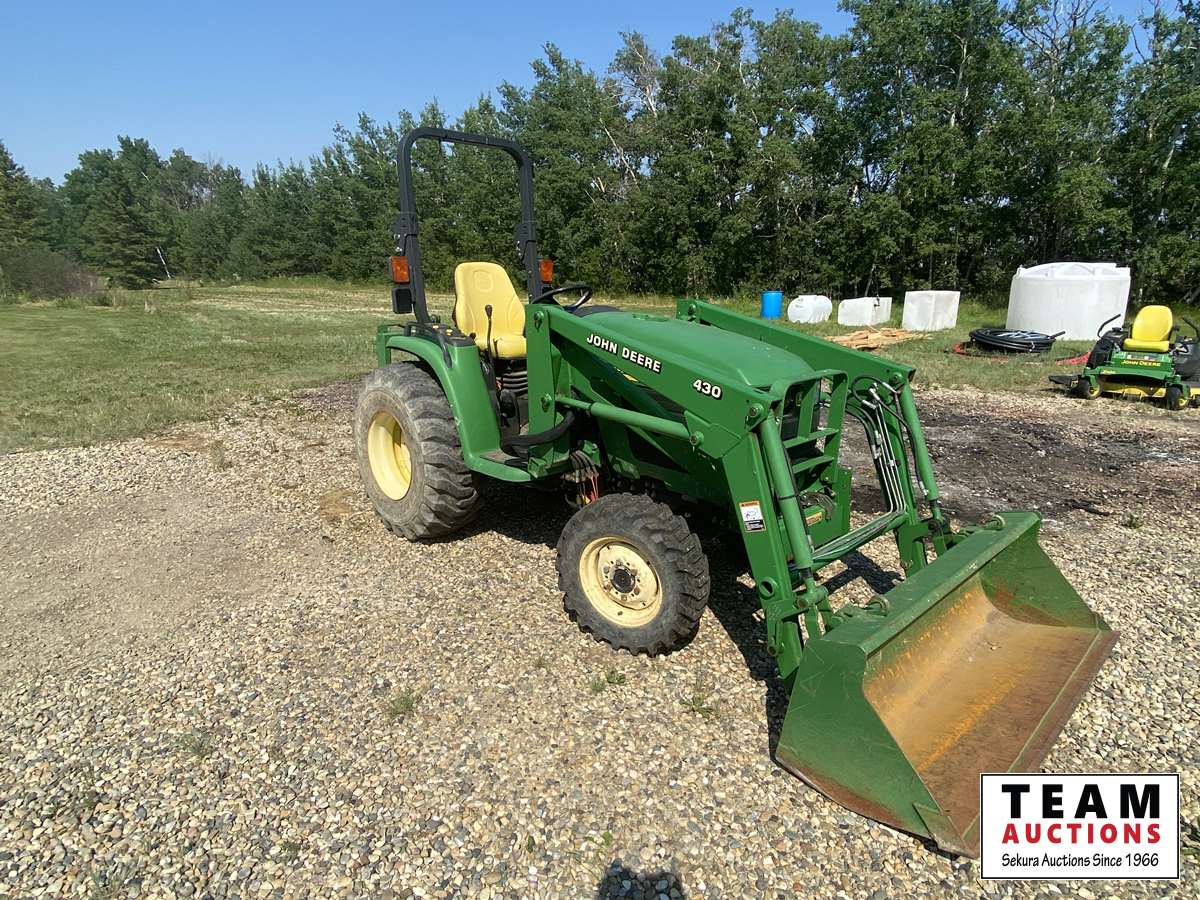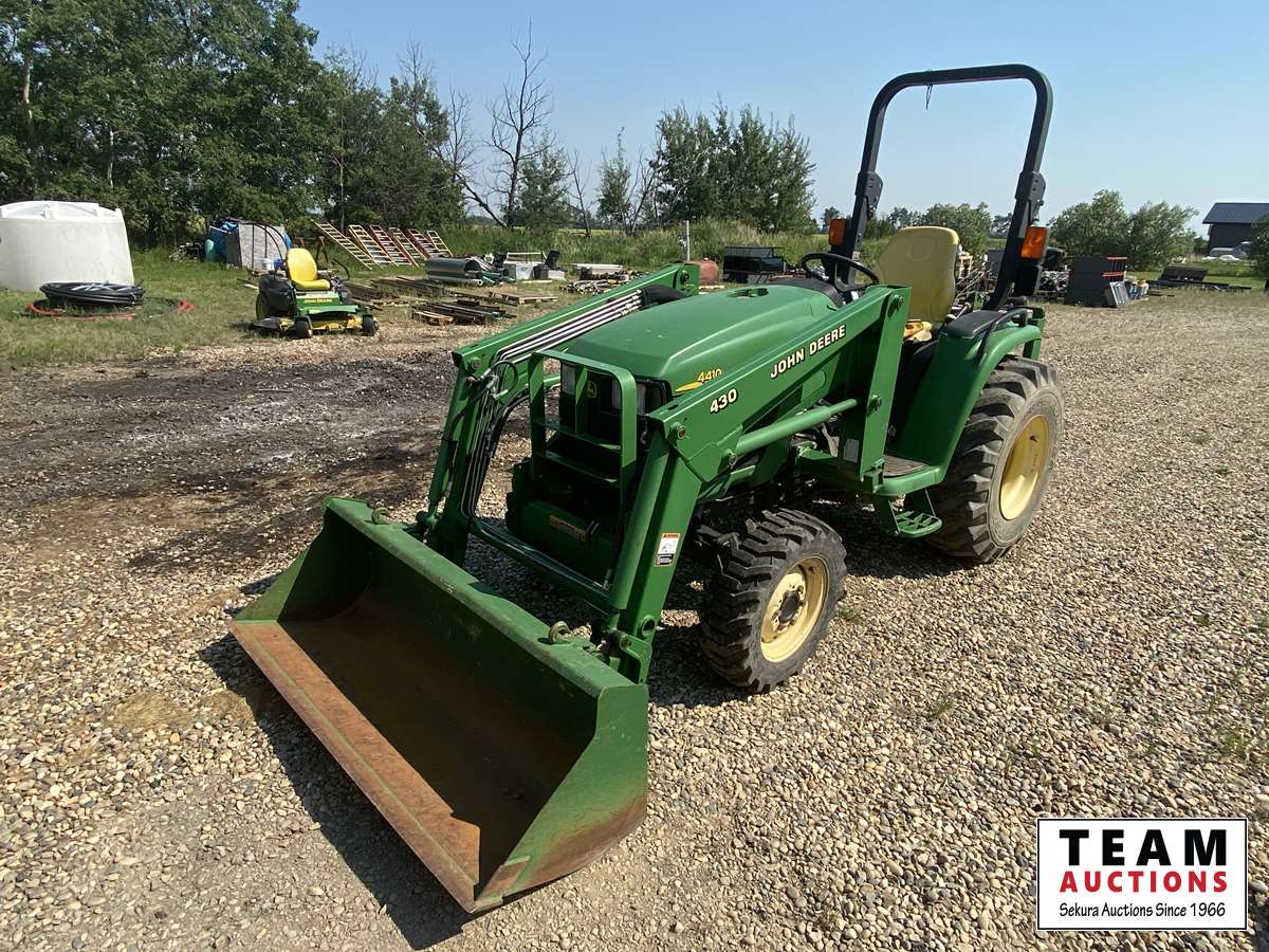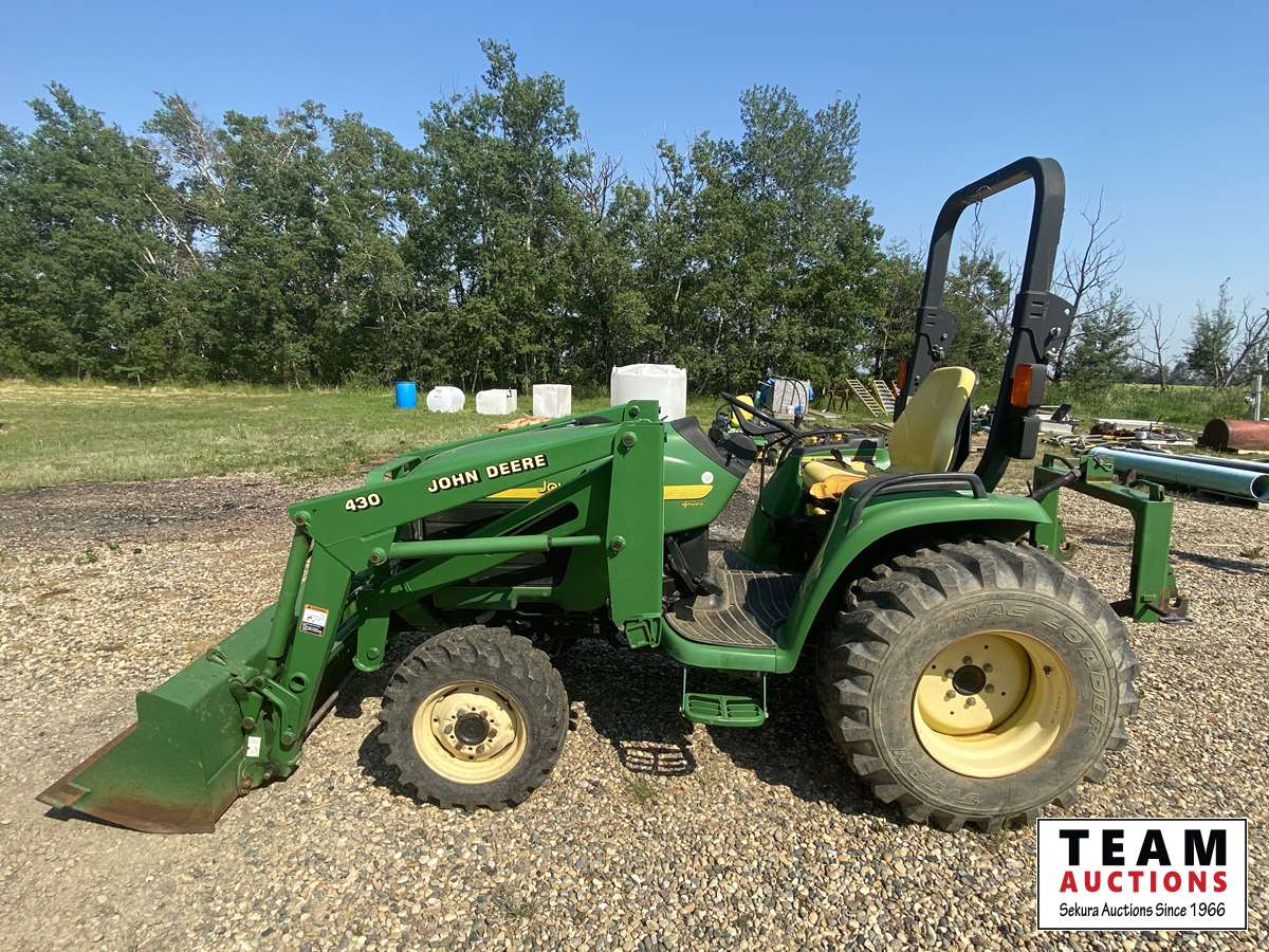 8 speed, diesel, John Deere 430 loader, 60" bucket, 540 pto, 3 pt, John Deere quick attach on 3 pt, weathered seat, R-4 tubeless front rubber, 15x19.5 rear rubber
