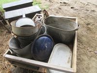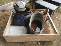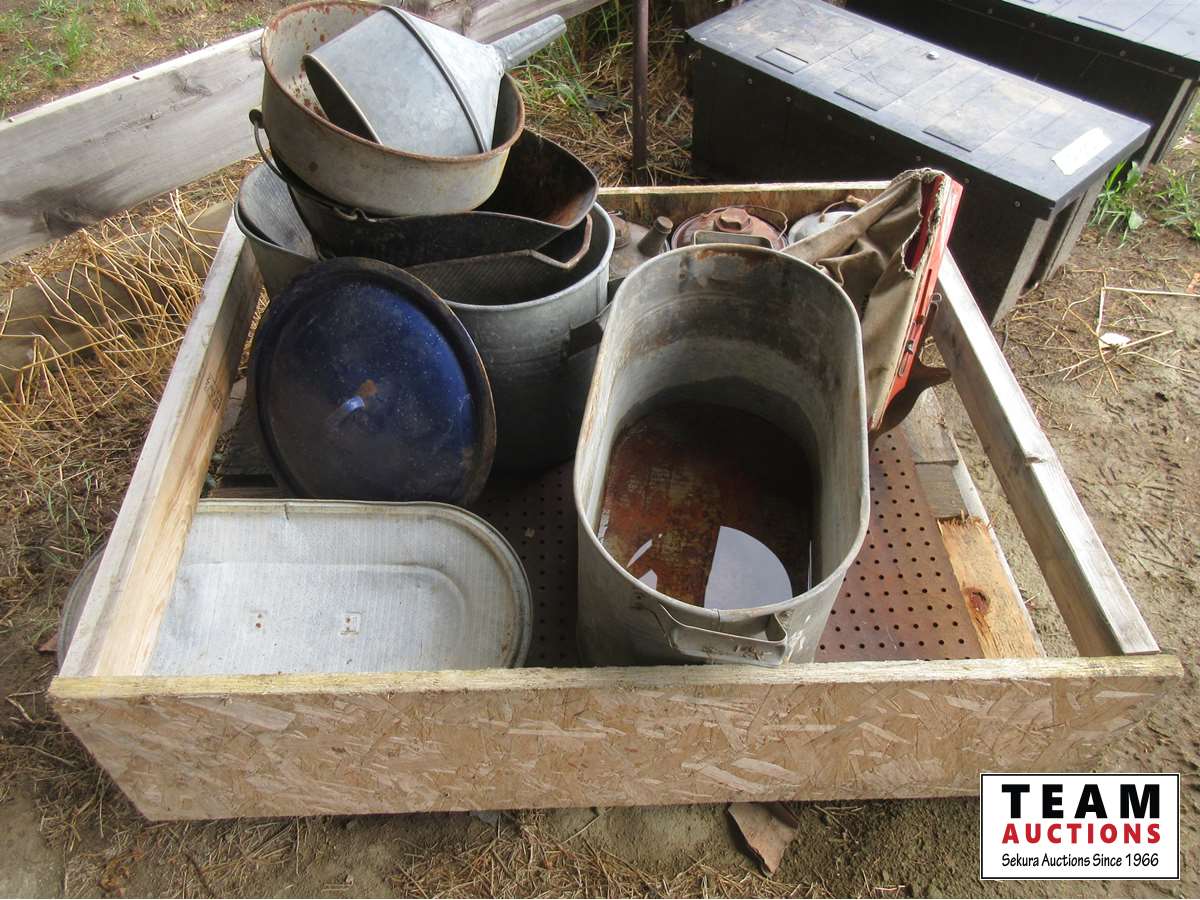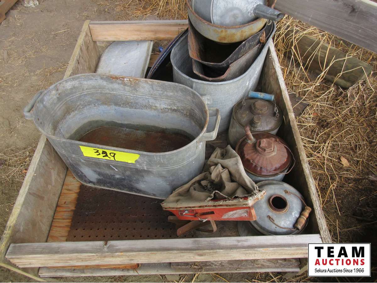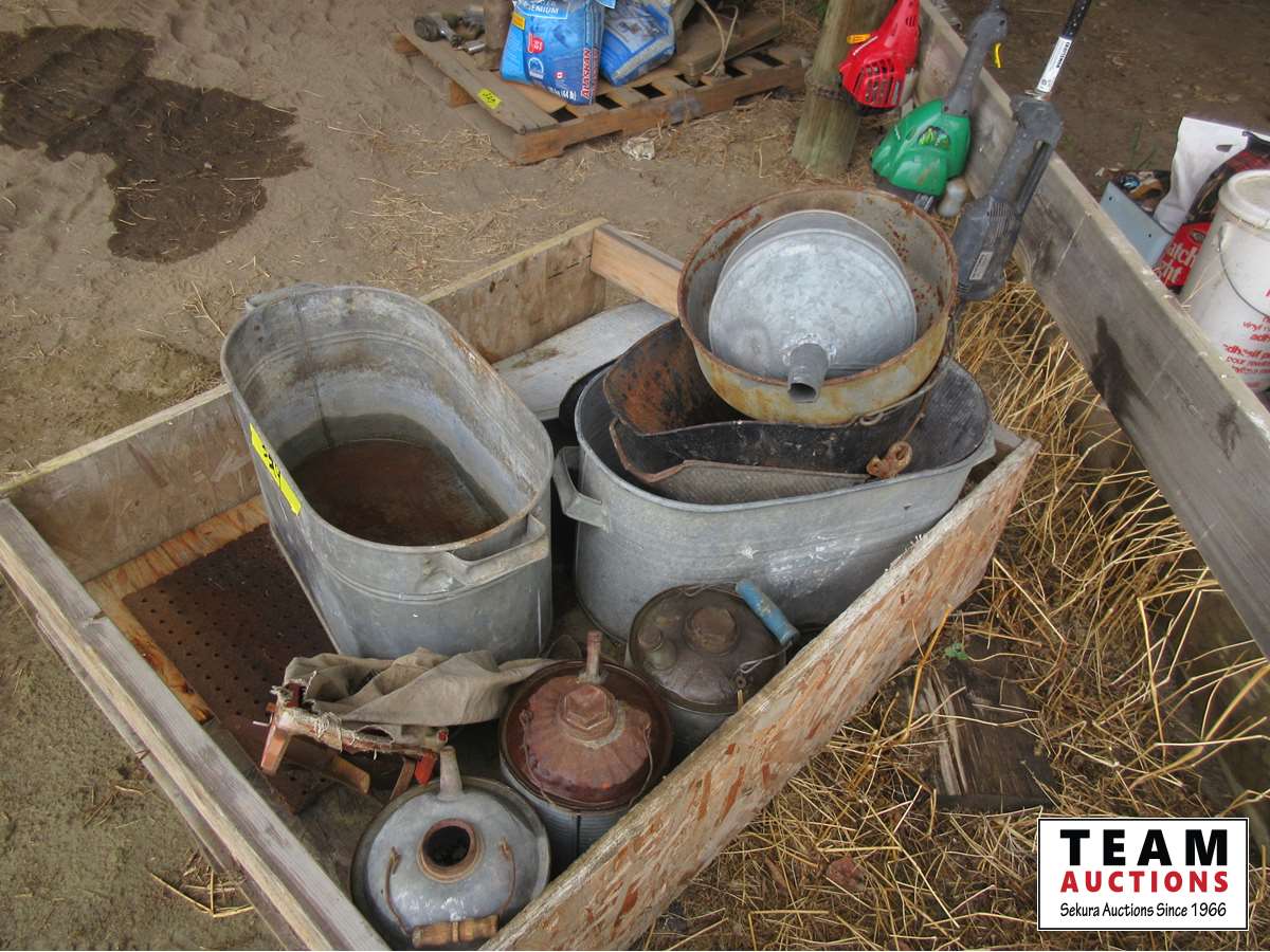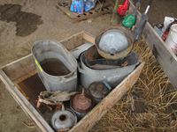 Metal tubs, funnel, hand broad caster, gas cans
