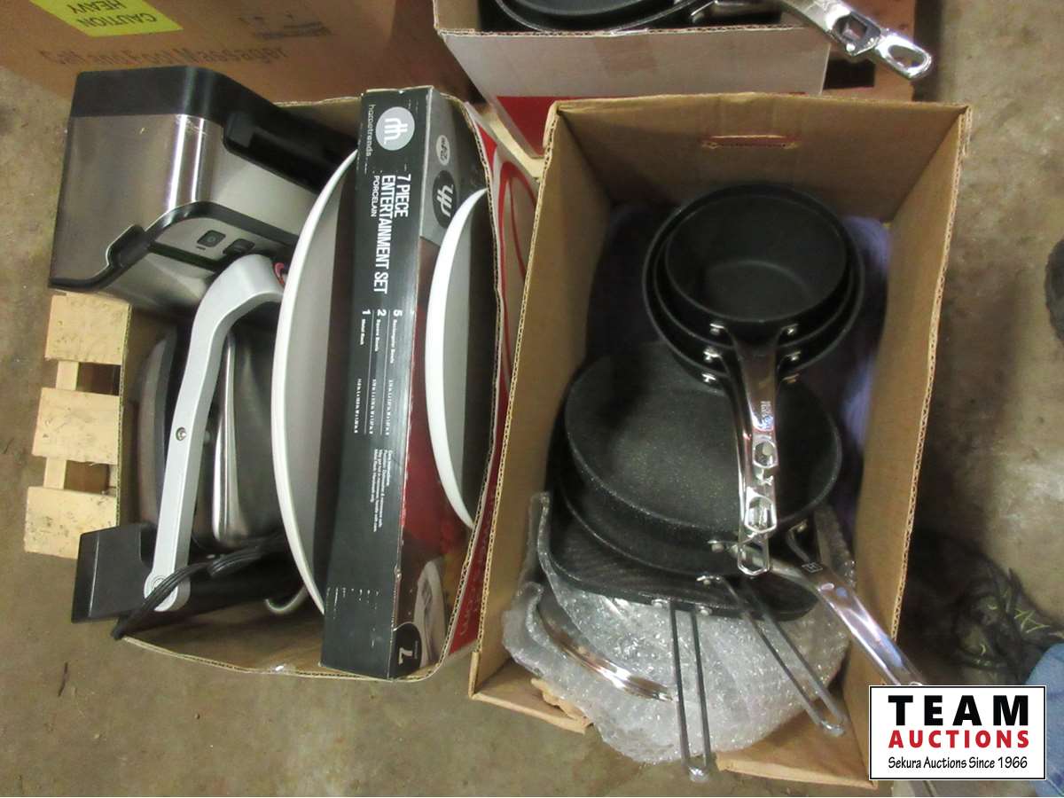 Frying pans, electric grill, bowls, food saver, 7 piece entertainment set, pots, miscellaneous