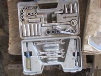 Fire Extinguisher, Stanley socket set, rubber mallet, Craftsman socket set, 18V drills, miscellaneous