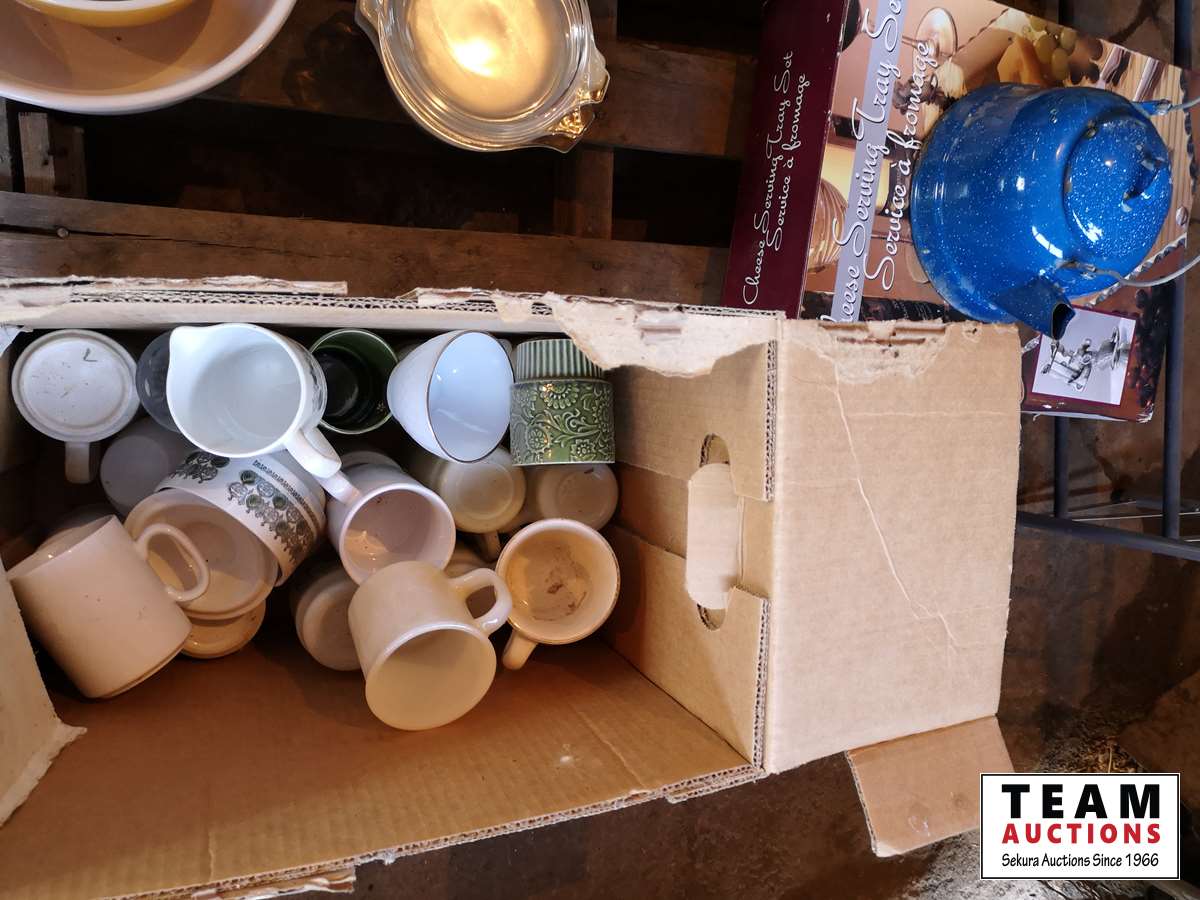 Cast iron frying pans, bowls, cups, cheese serving tray, kettle, shoe rack, fondue set, miscellaneous household
