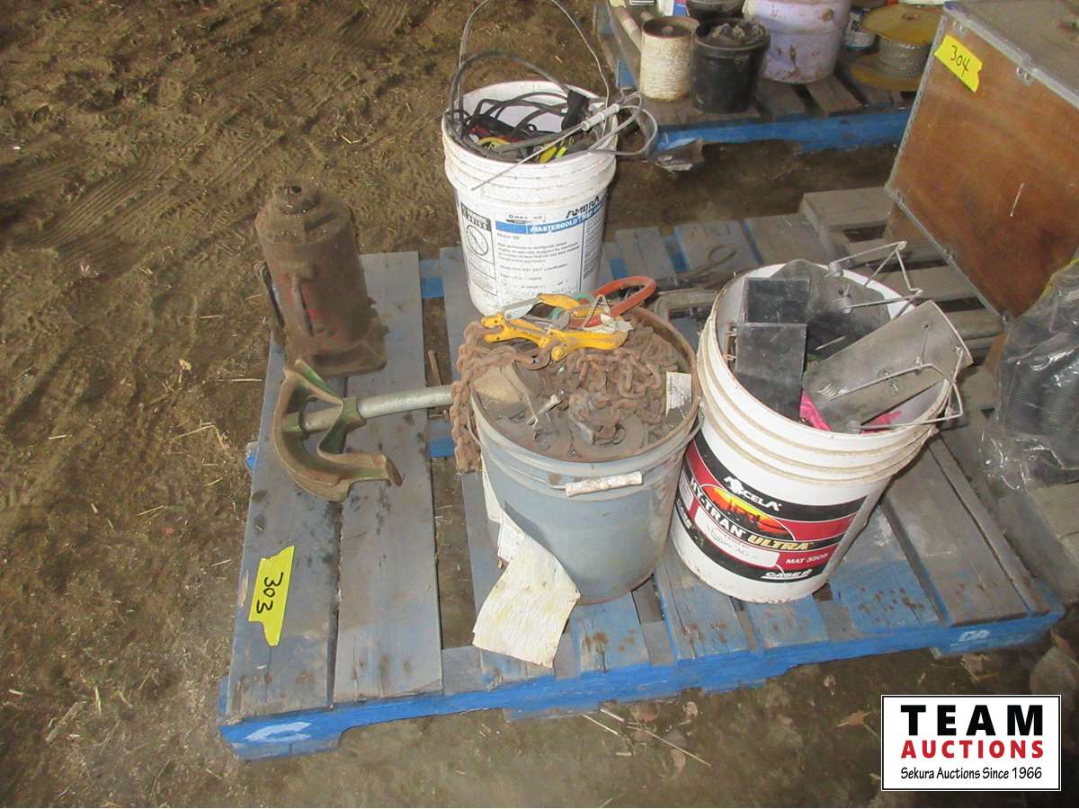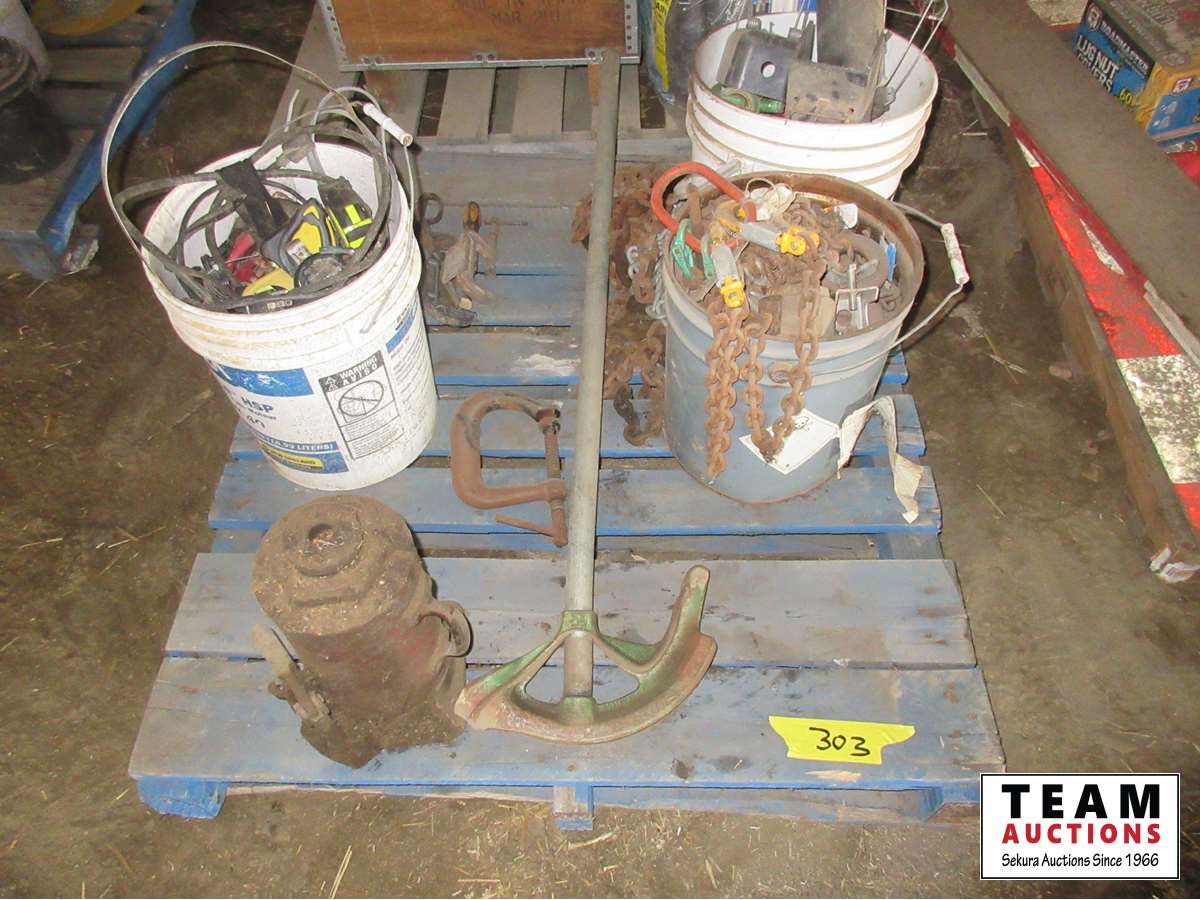Tubing bender, chain slings, tape measures, booster cables, hydraulic jack, chains, C clamps
