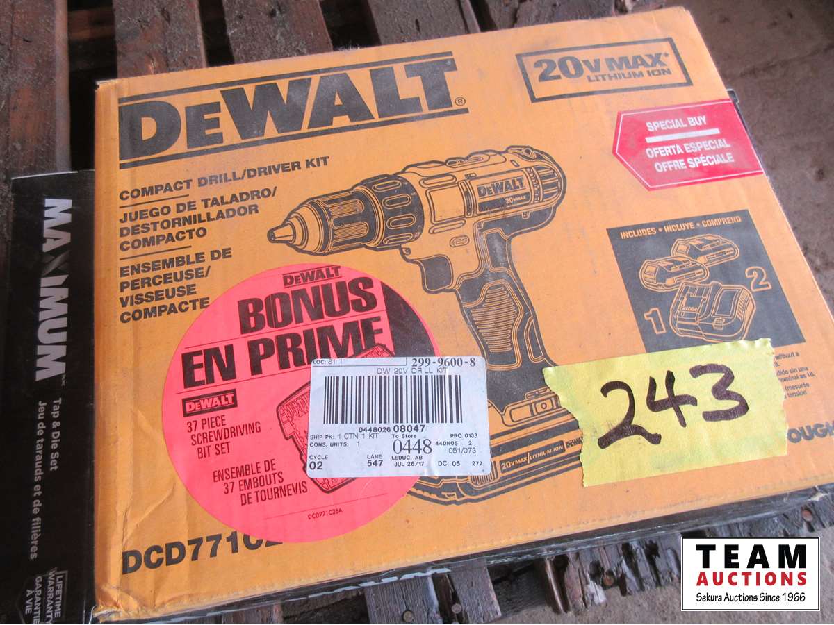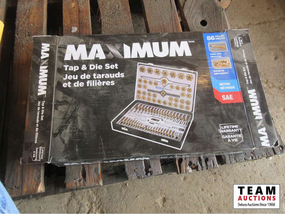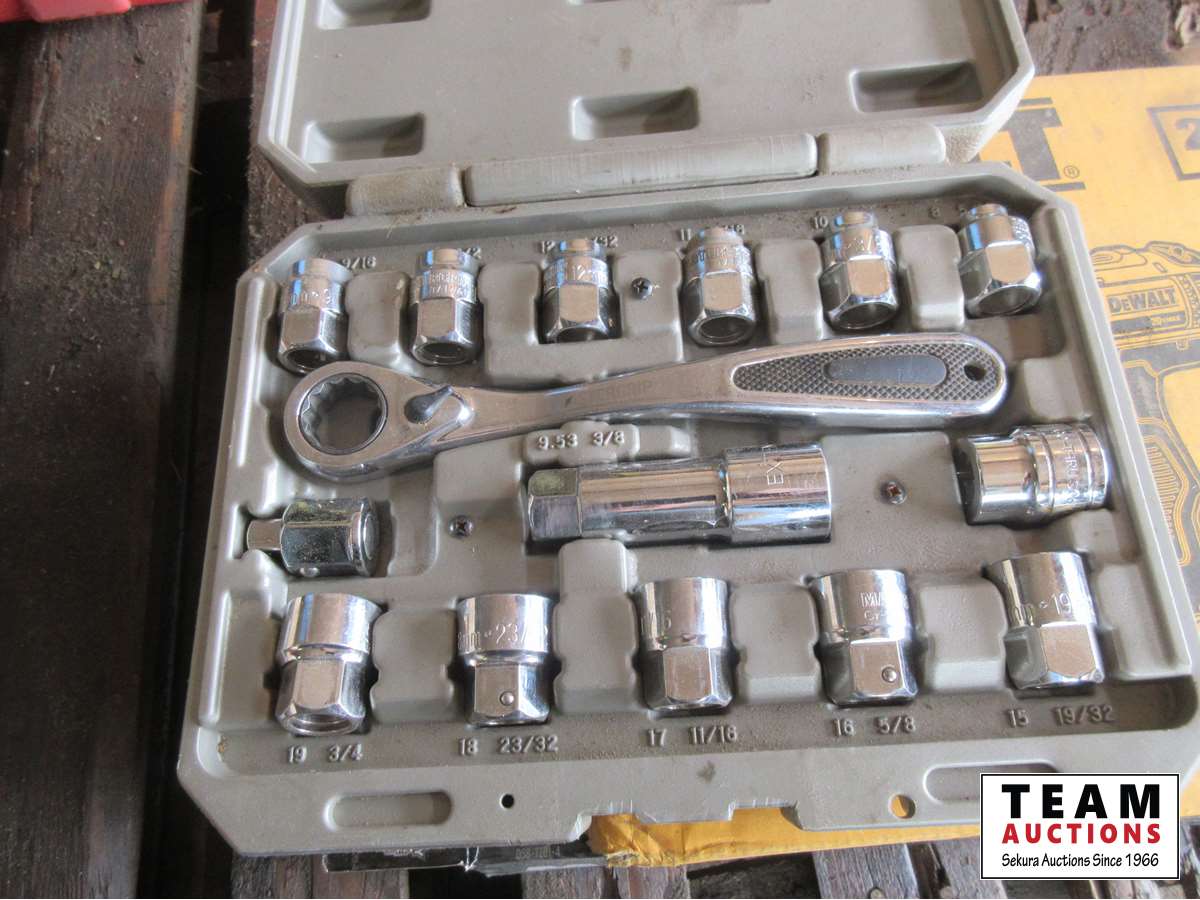 Dewalt 20V drill/driver with charger and (2) batteries, Maxium 86 piece Tap & die set, pass thru socket set