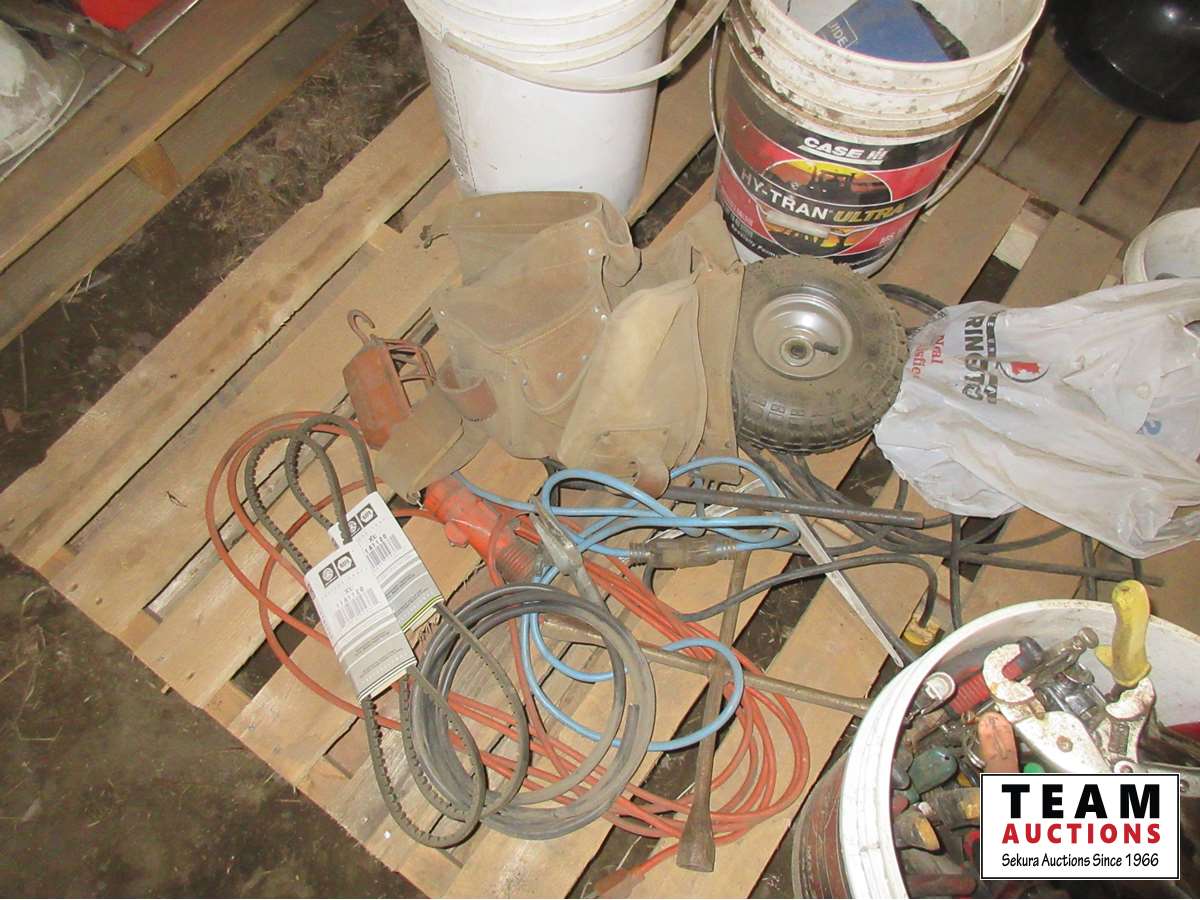 Bucket full of hand tools, trouble light, (2) carpenters belts, Hardware, wheelbarrow wheel, U bolts, guards for Case IH swather