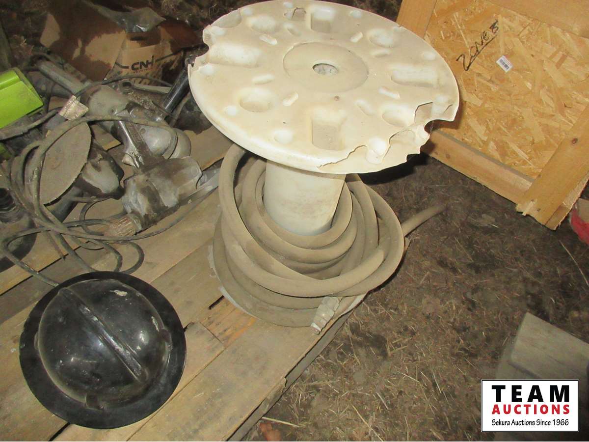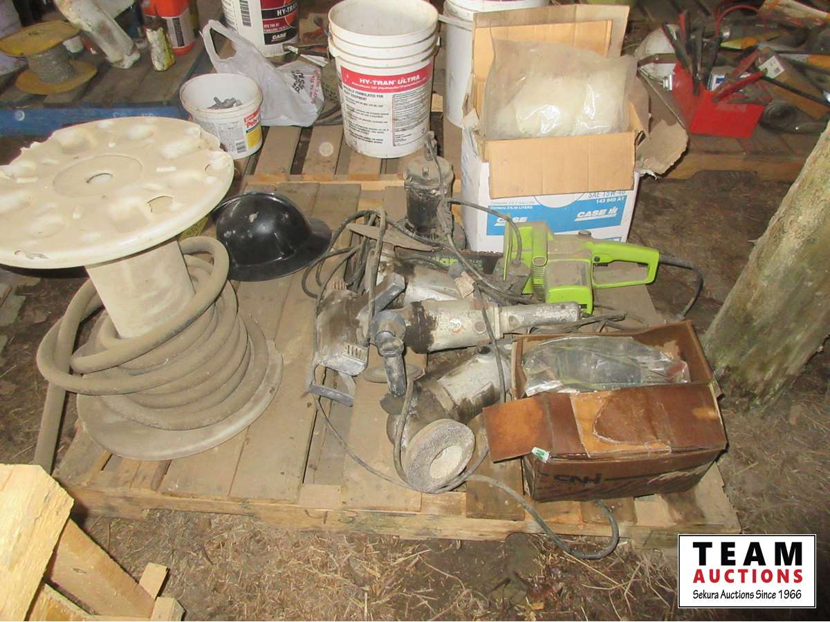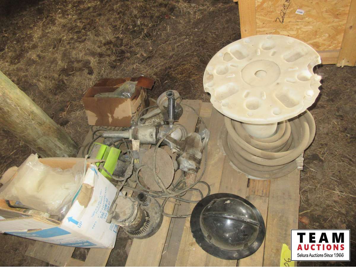 Hose, (3) angle grinders, 1/2 inch drill, electric chain saw, sump pump, box of Bison gear motors, large bag of zip ties, lights, miscellaneous parts