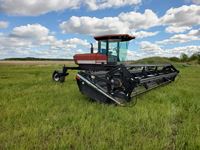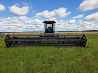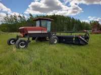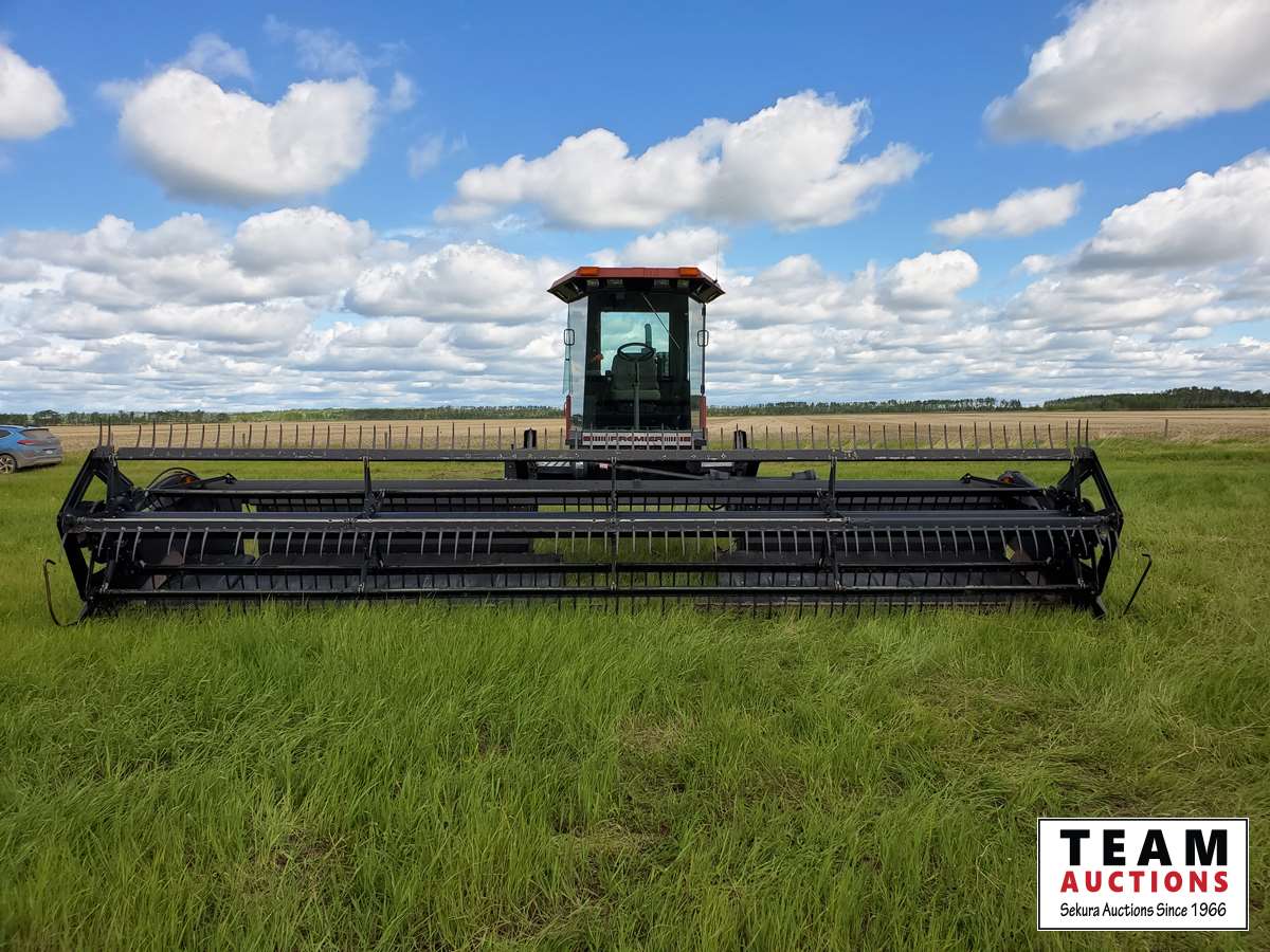 Cummins diesel engine, 1998 MacDon 960 24 ft header, cab, heat, air, double swath, pickup reel, newer canvases, 70% 21.5L-16.1SL drive rubber, 70% 16.5L-16.1SL caster rubber, 2183 hrs