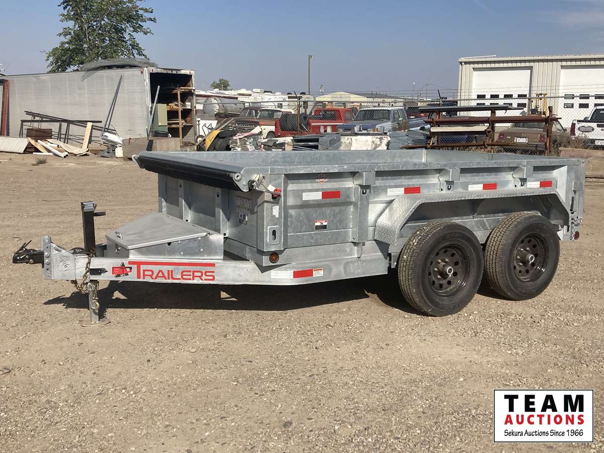 77 inch wide, 2-5/16 inch ball hitch, external charge port, electric over hydraulic hoist, electric controller, 2 door hatch, roll tarp, 5200 lb axles, spring suspension, 225/75R15