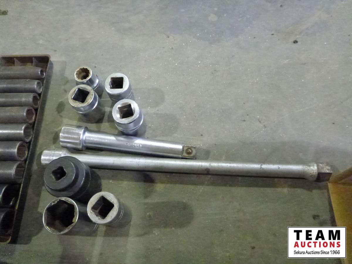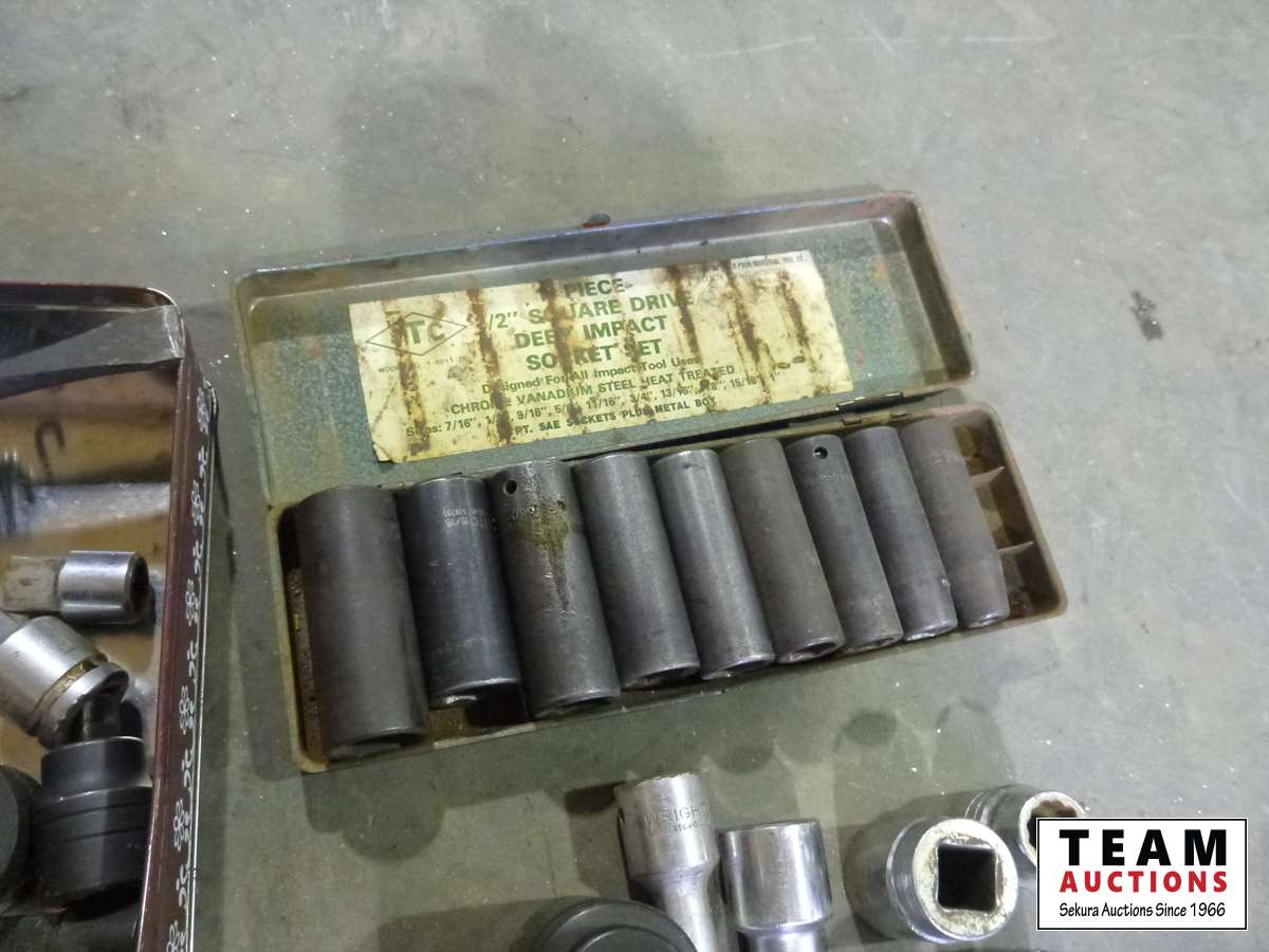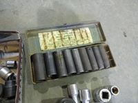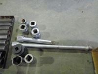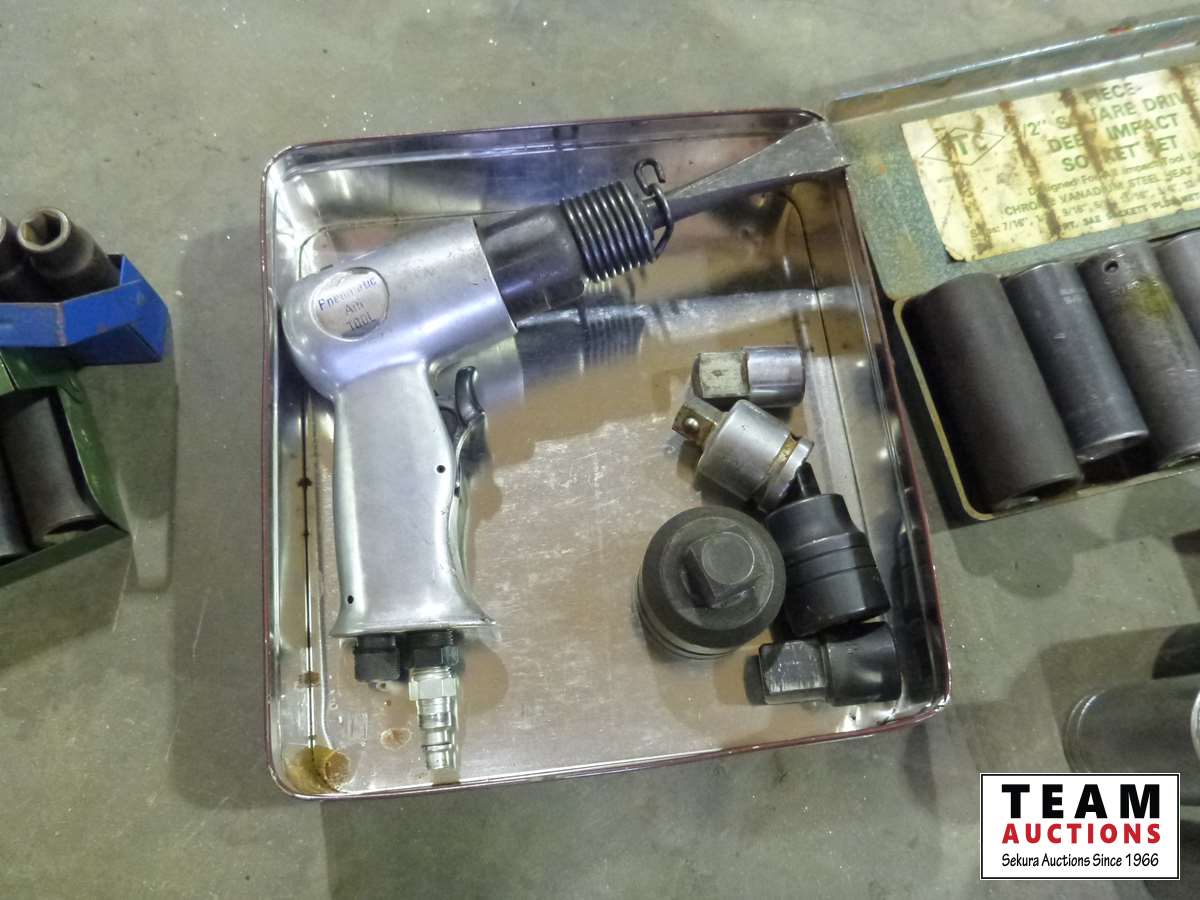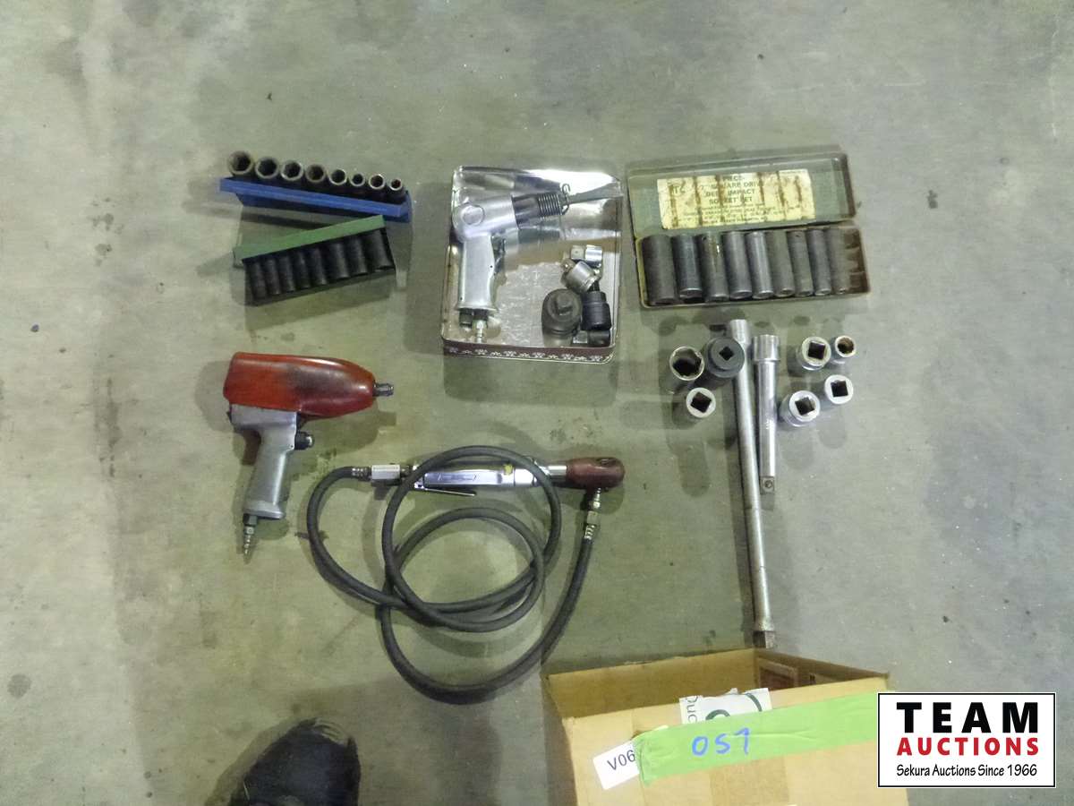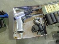 Air chisel, 1/2 inch impact, 3/8 ratchet, (2) sets of 1/2 ft impact standard sockets, (1) set of 3/8 inch standard impact sockets, miscellaneous extensions and adaptors