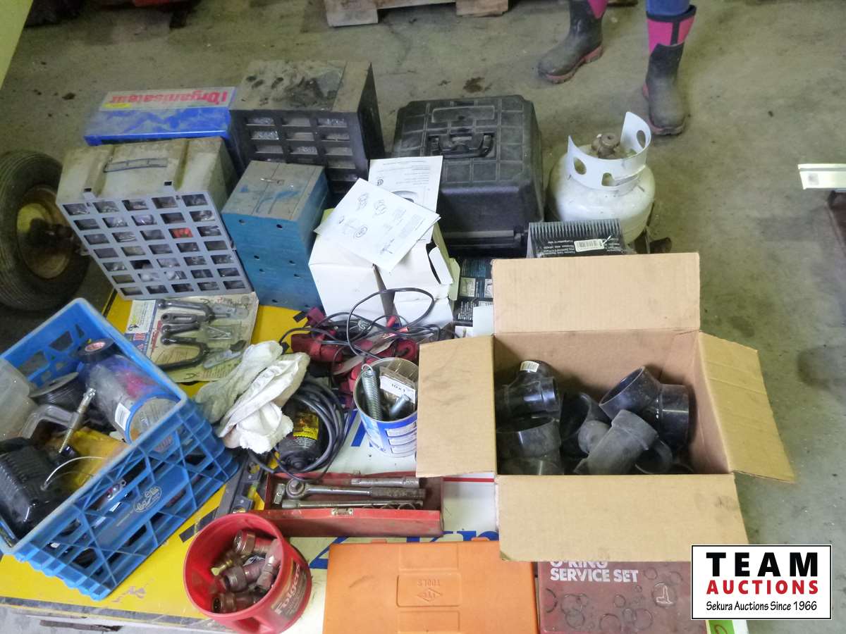 O ring kits, cross wrench, electrical wire, plumbing supplies, small socket set, hydraulic fittings, (4) small parts organizers, automotive lights, miscellaneous