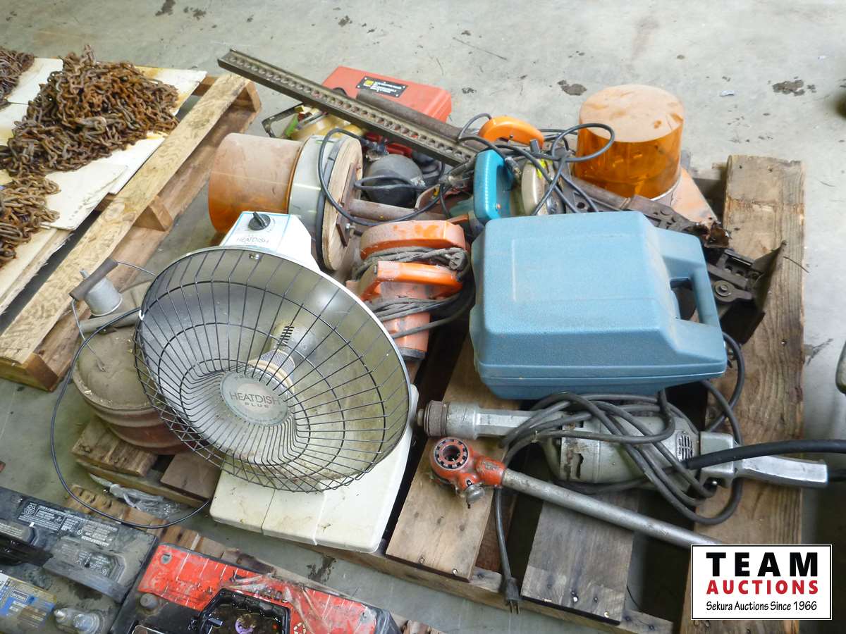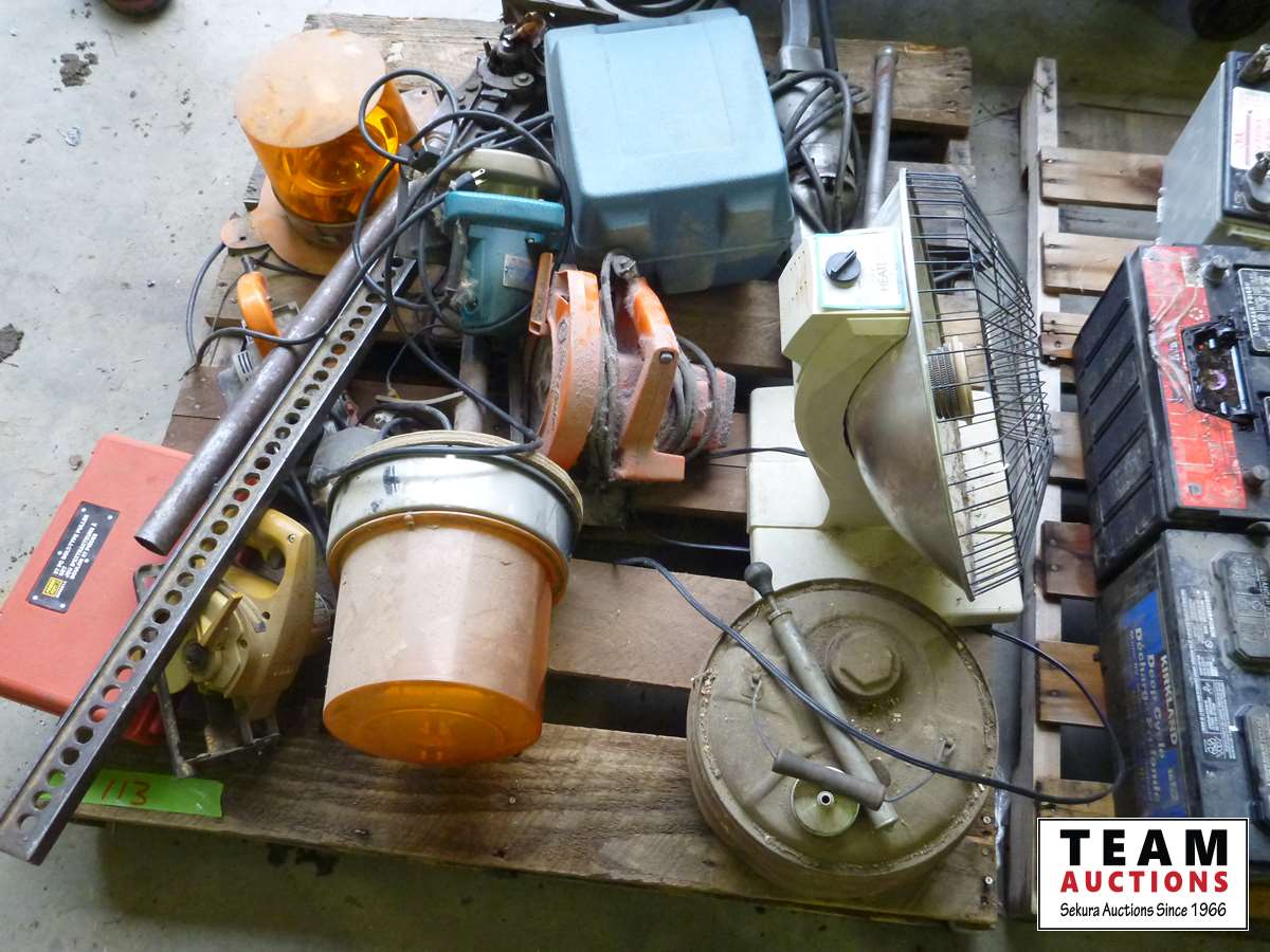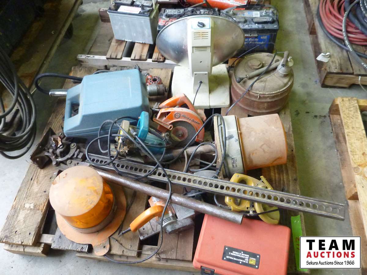 (3) circular saws, (2) rotating beacon lights, vintage gas can, small heater, Jackall, pipe threader, B&D router, miscellaneous