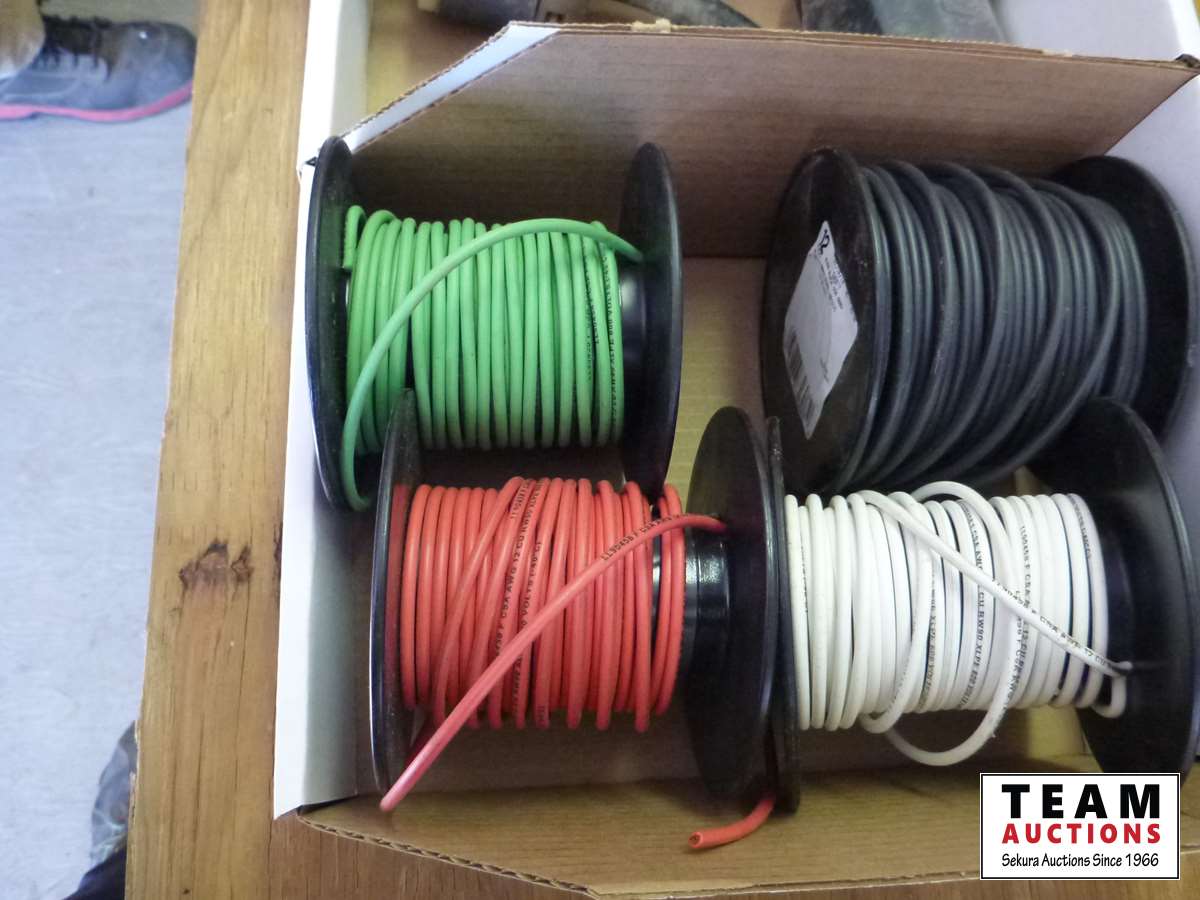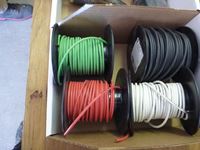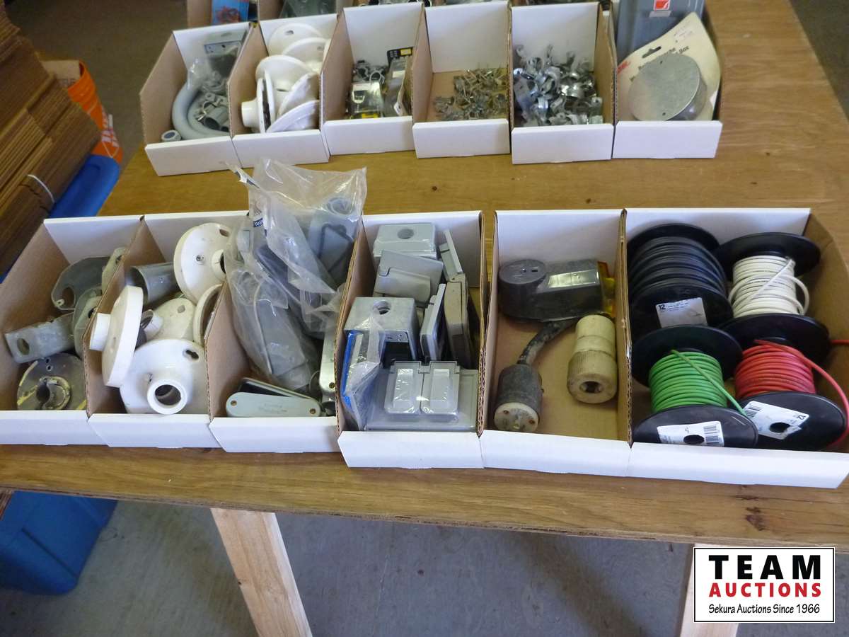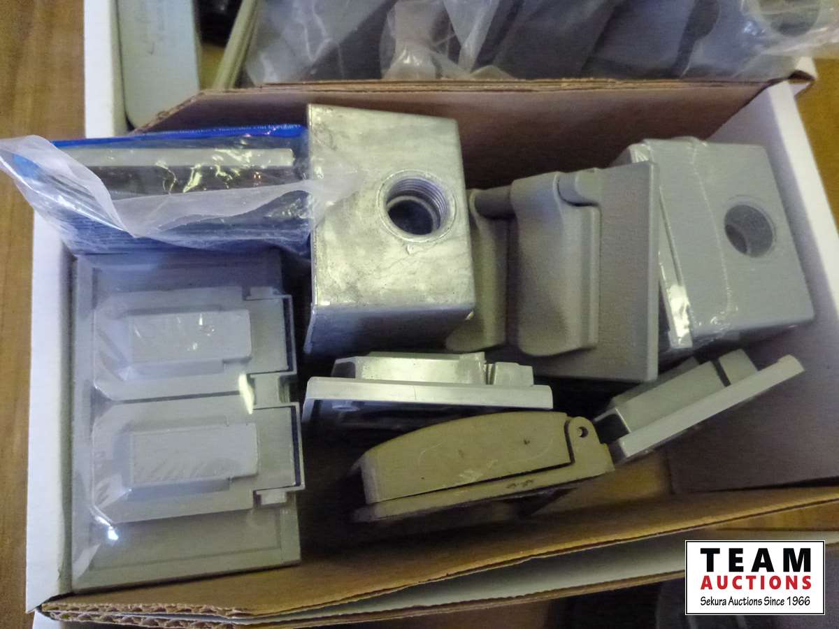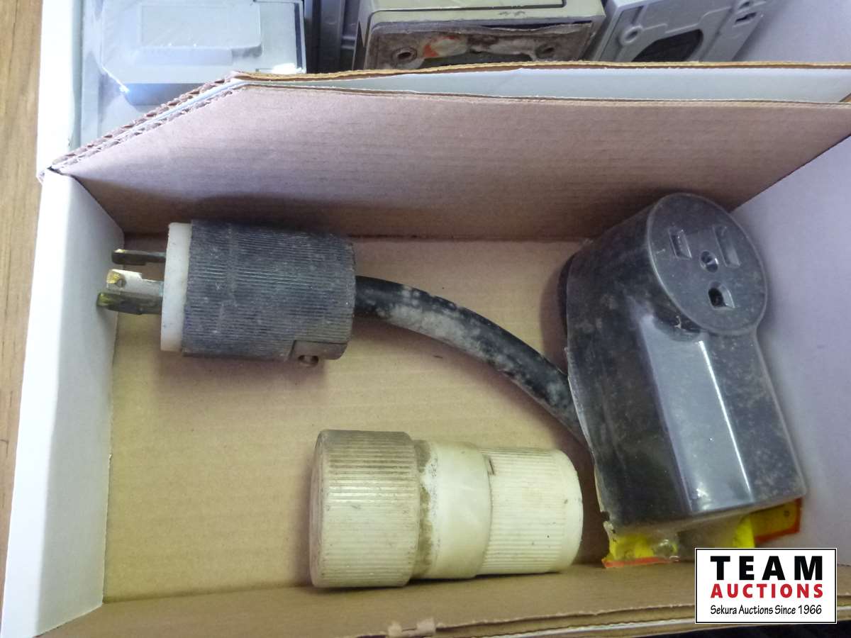 Junction boxes, light socket outlets, conduit bodies, (4) rolls of 12 gauge wire, 220 volt receptacle twist lock cord ends, weather proof boxes