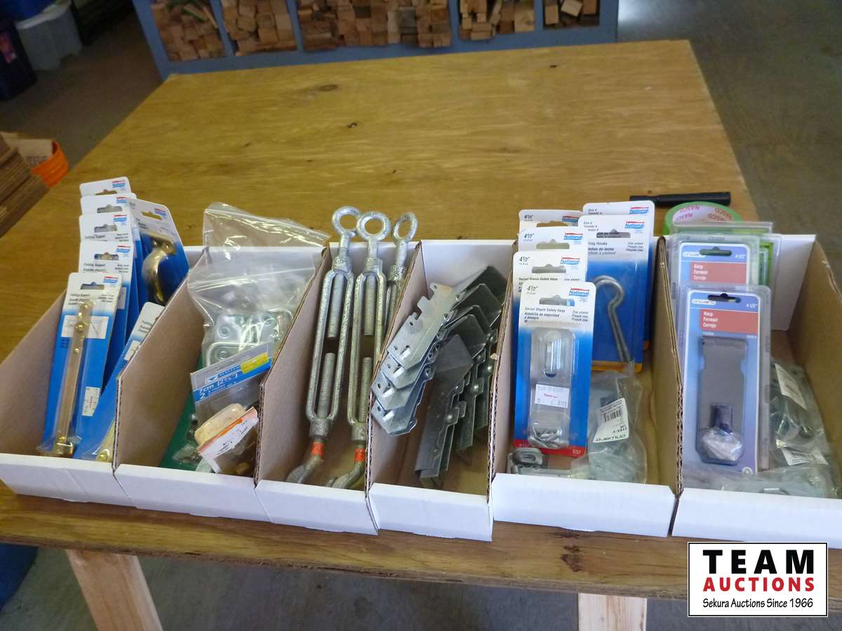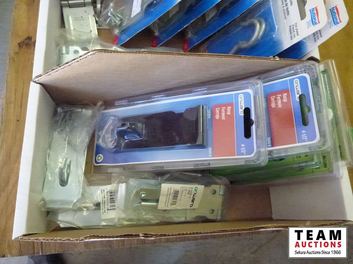Folding supports, latches, hinge & handle packages, swivel safety hasp, lock hasps, joist hangers