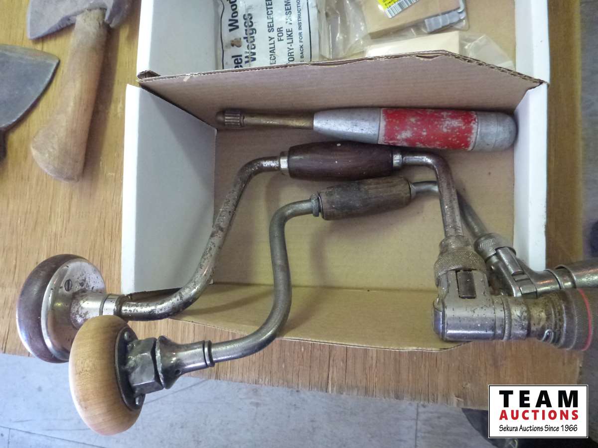 Drill braces, hand drill screw driver, hatchet, axe heads, chalk lines, chalk, plumb bob, sliding hooks, nail remover, saw