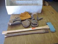 Double head axe, axe handle, wooden carpenters tool box, (2) carpenters belts