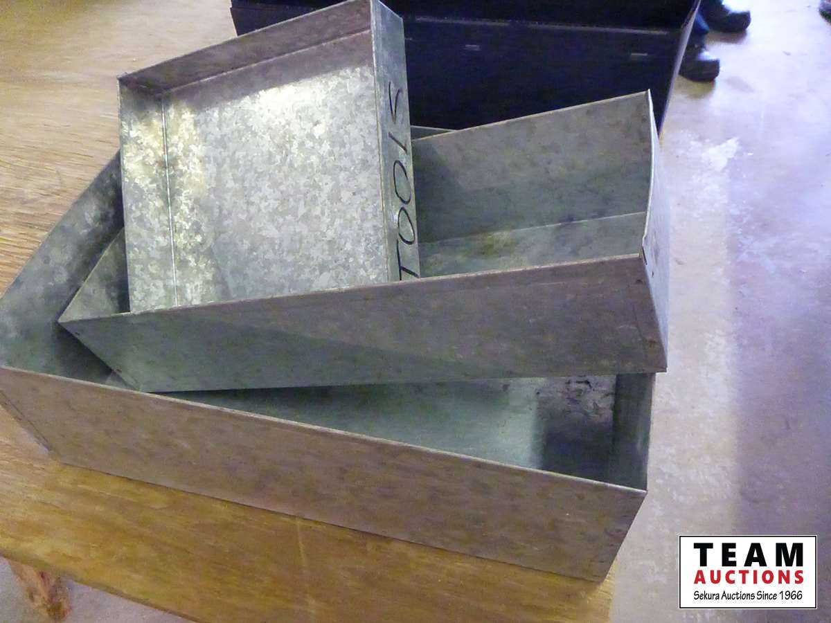 (3) galvanized container trays, (3) coraplast boxes, coffee pot, (2) cooking pots