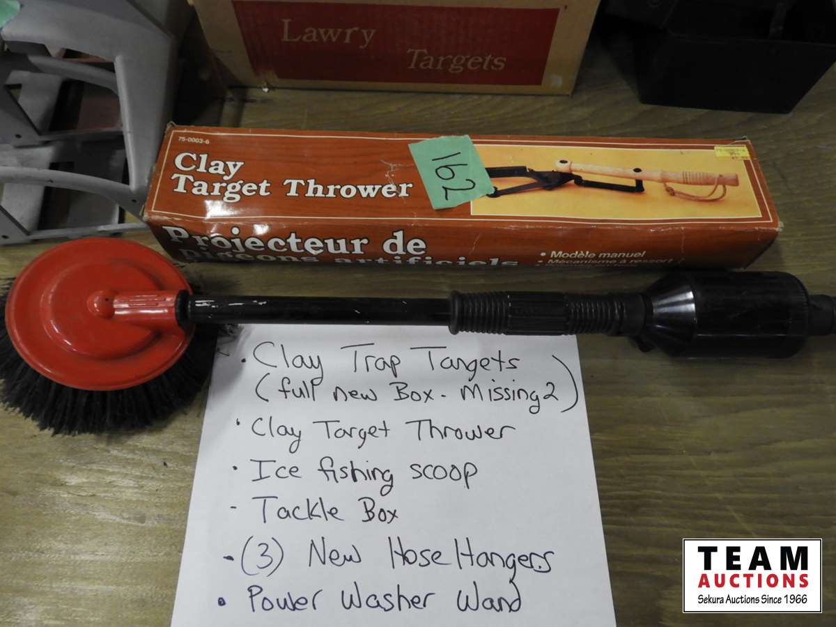 Clay trap targets (full box les 2), clay trap thrower, ice fishing scoop, tackle box, (3) hose hangers, power wash wand with brush