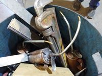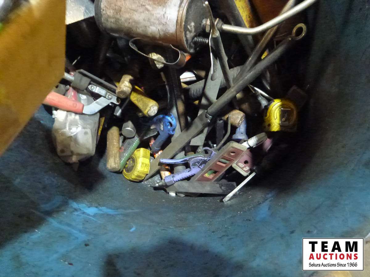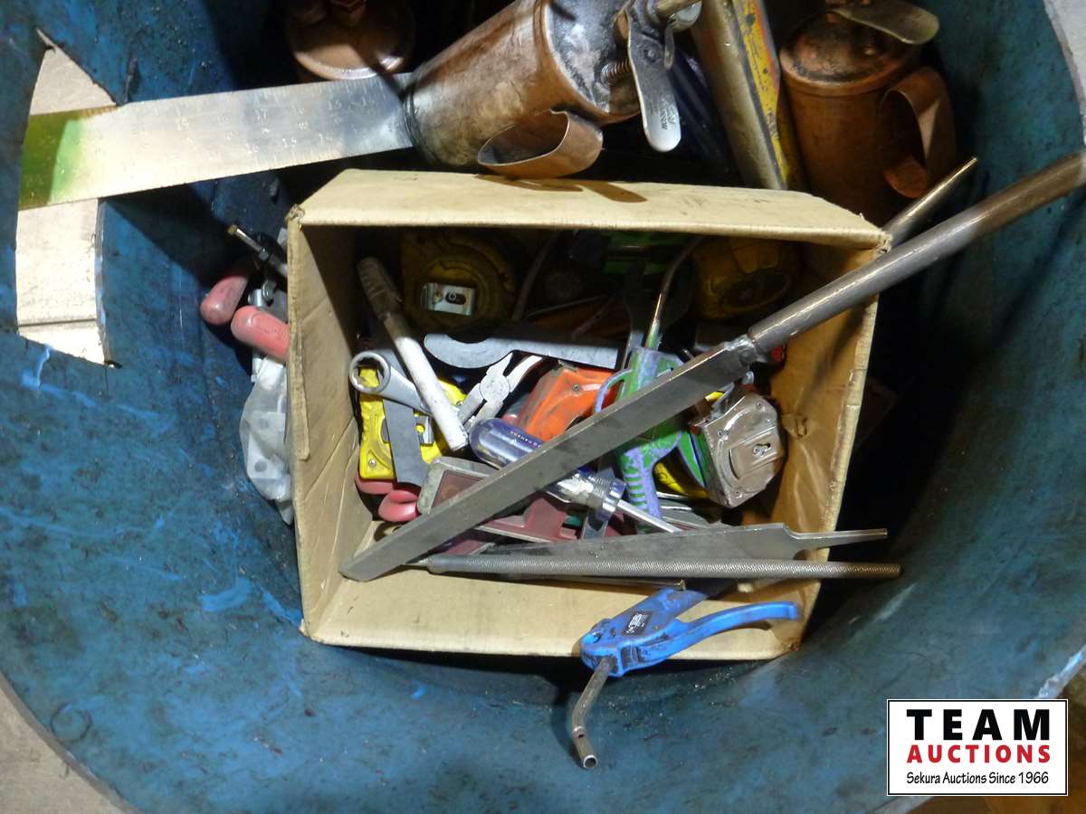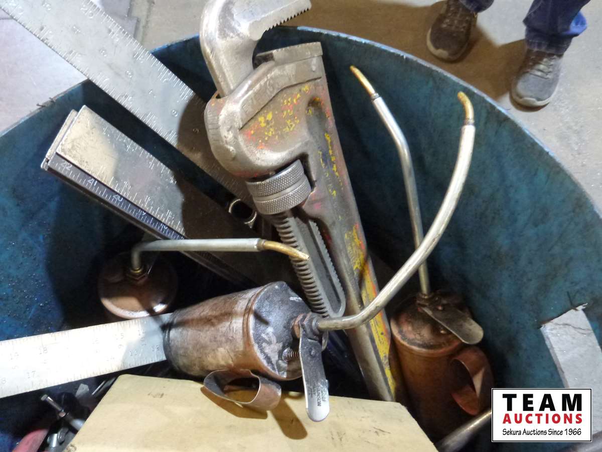 Miscellaneous tools, squares, oil cans, large pipe wrench, tape measures