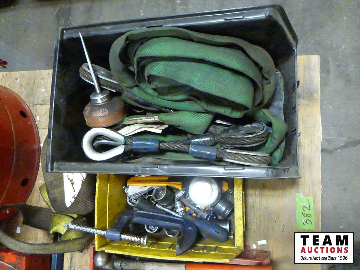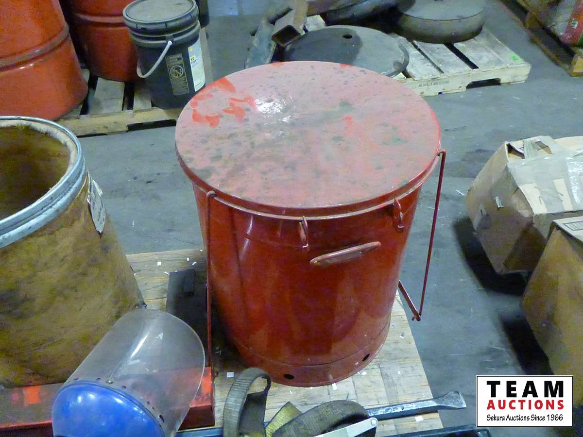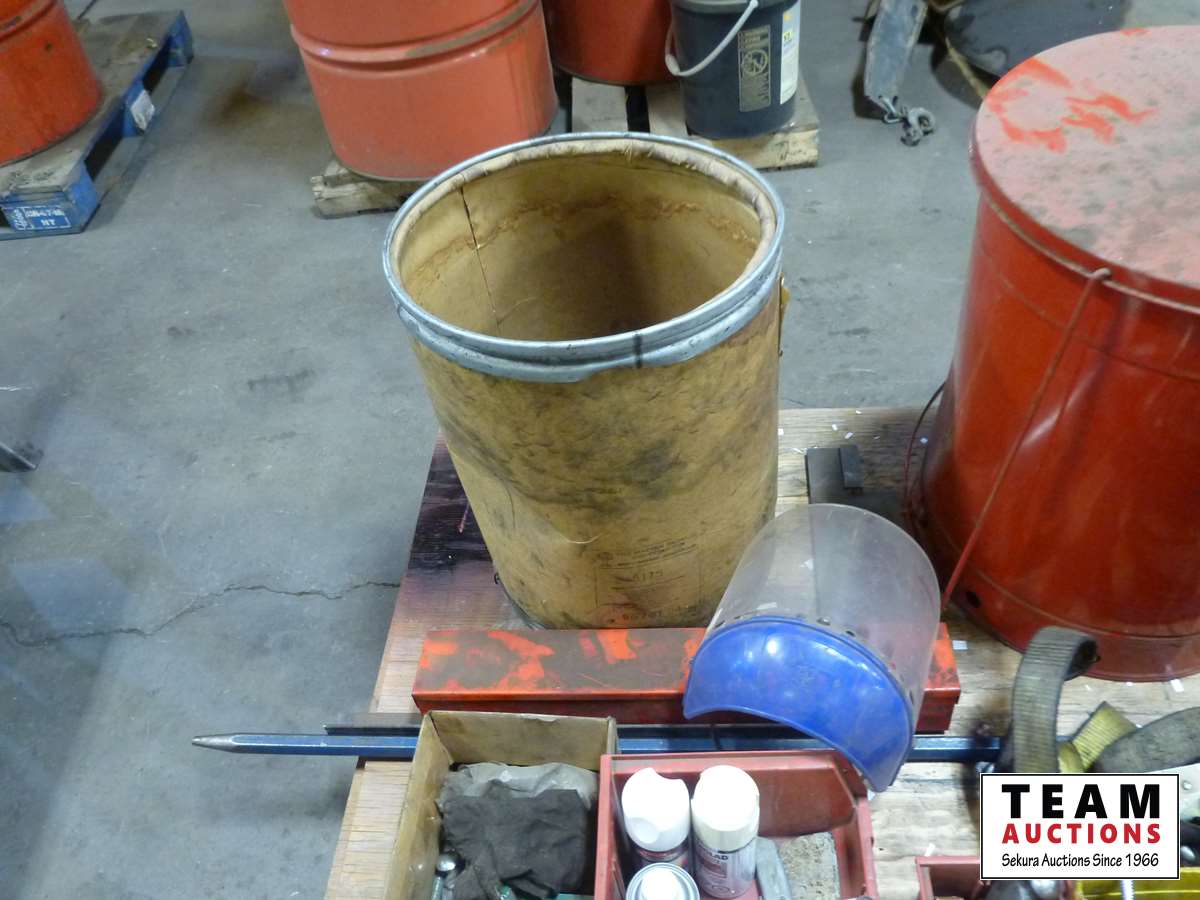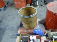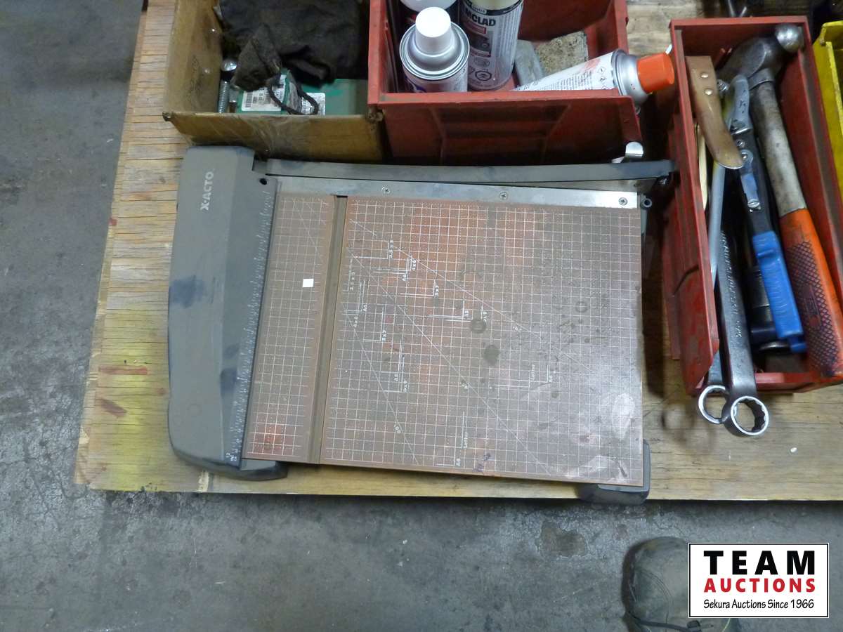 Garbage can, tools, bars, paper cutter, miscellaneous shop items
