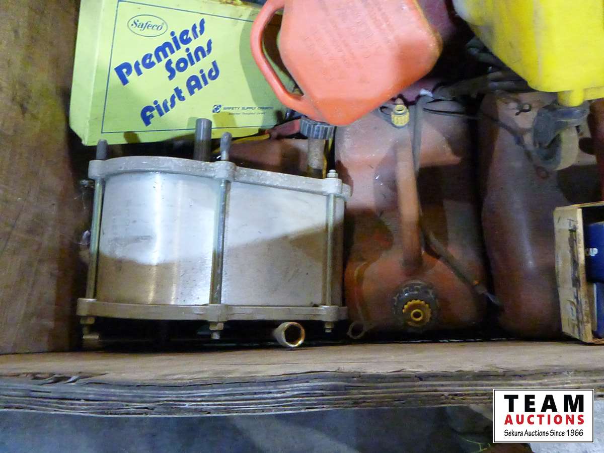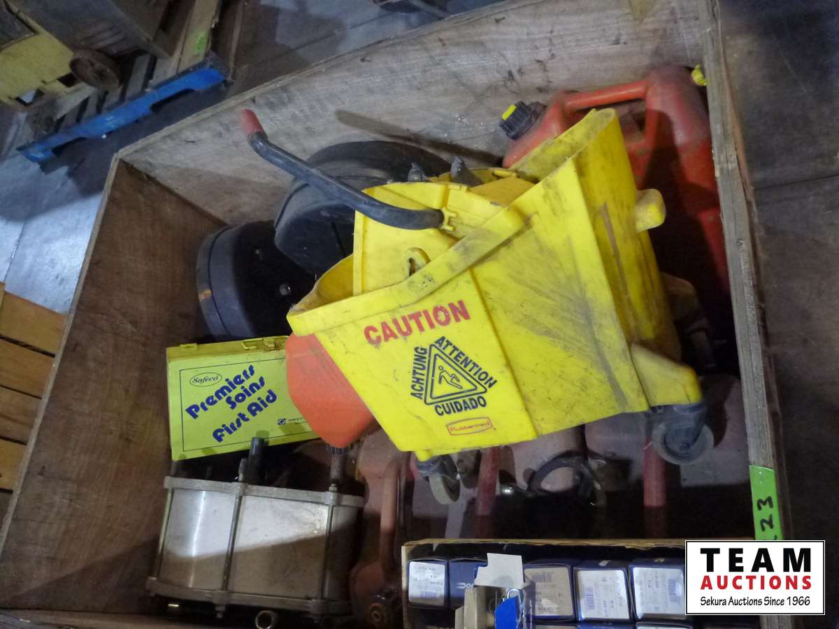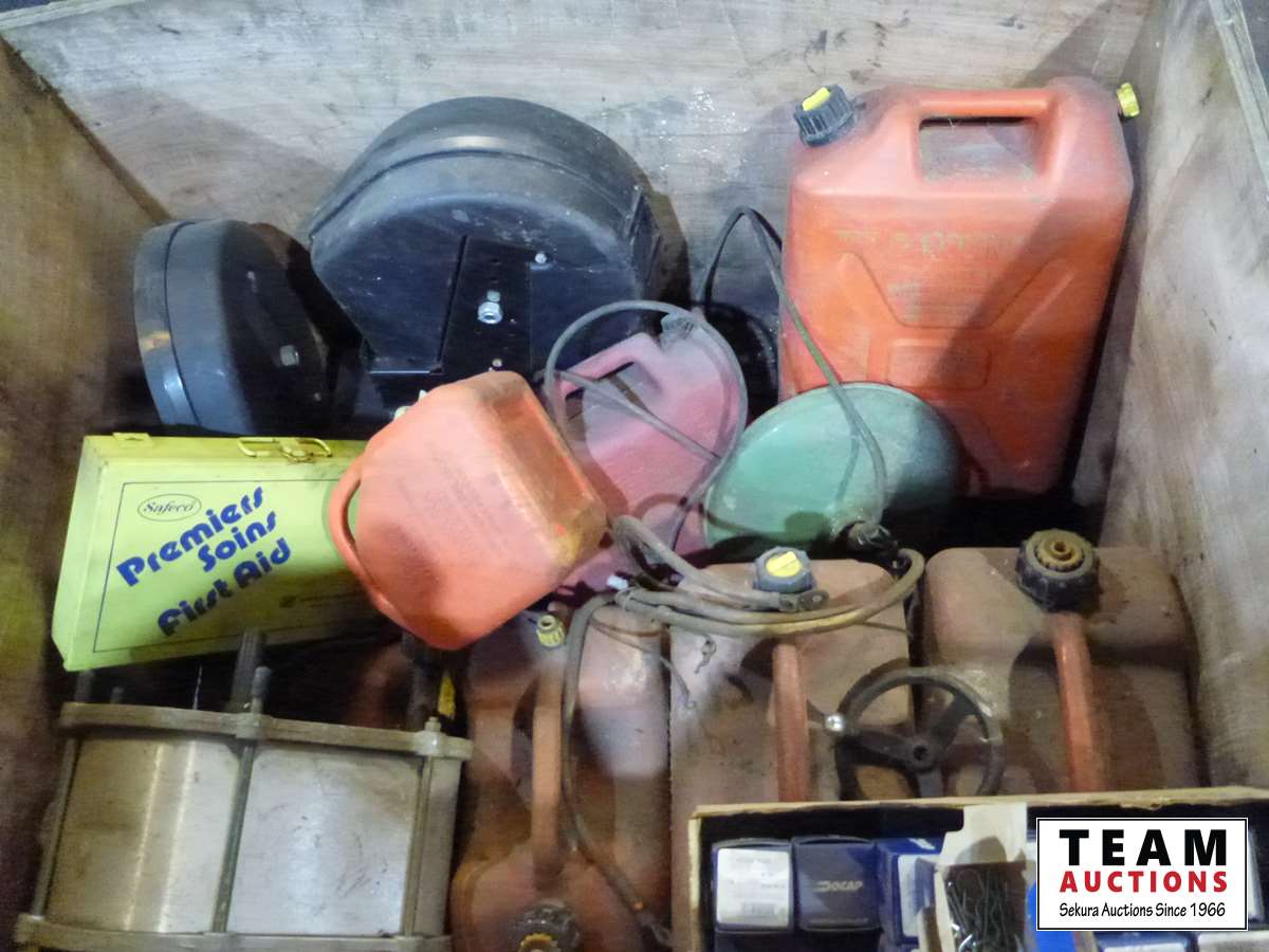 Gerry cans, mop pail, hitch pins, miscellaneous hardware