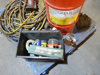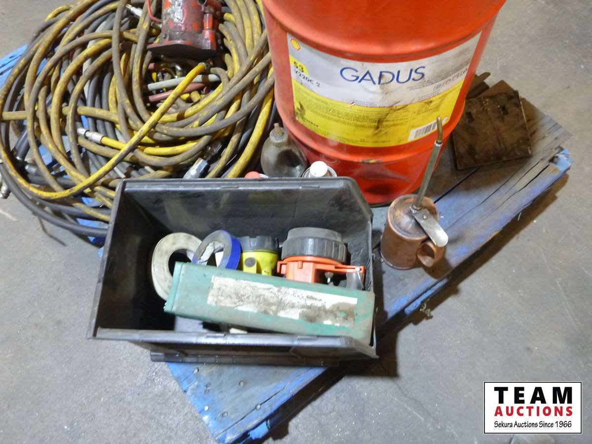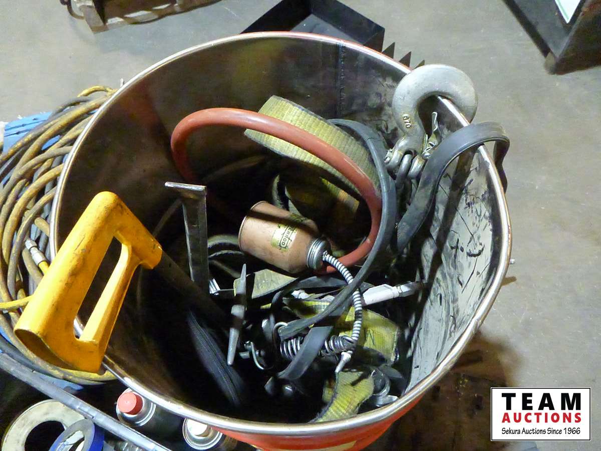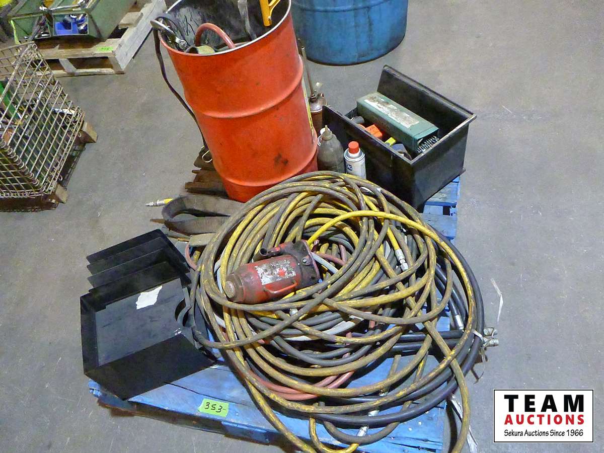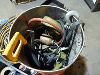 Air hose bottle jack, oil can, flashlights, ratchet straps, miscellaneous items