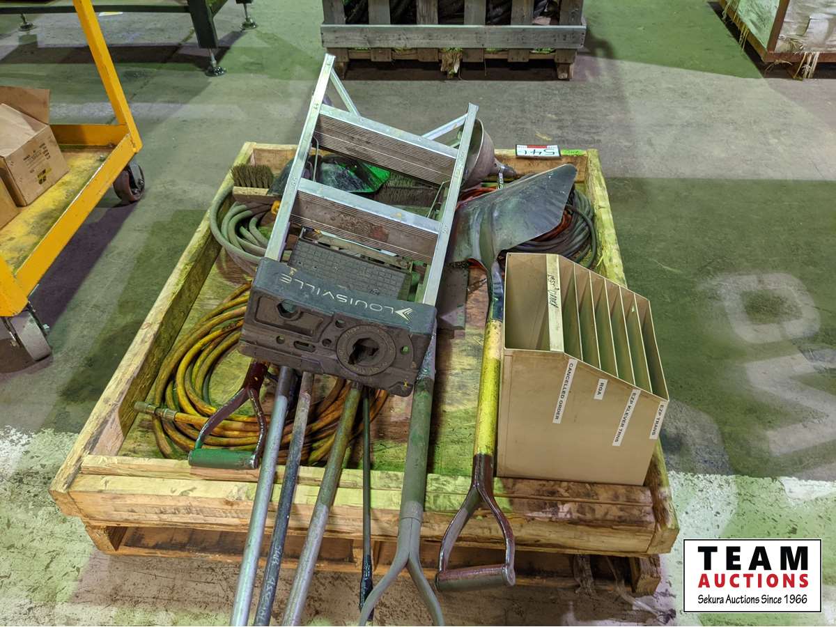 Step ladder, shovel, hammers, extension cords, air hose. , miscellaneous