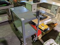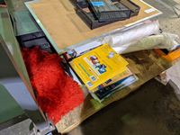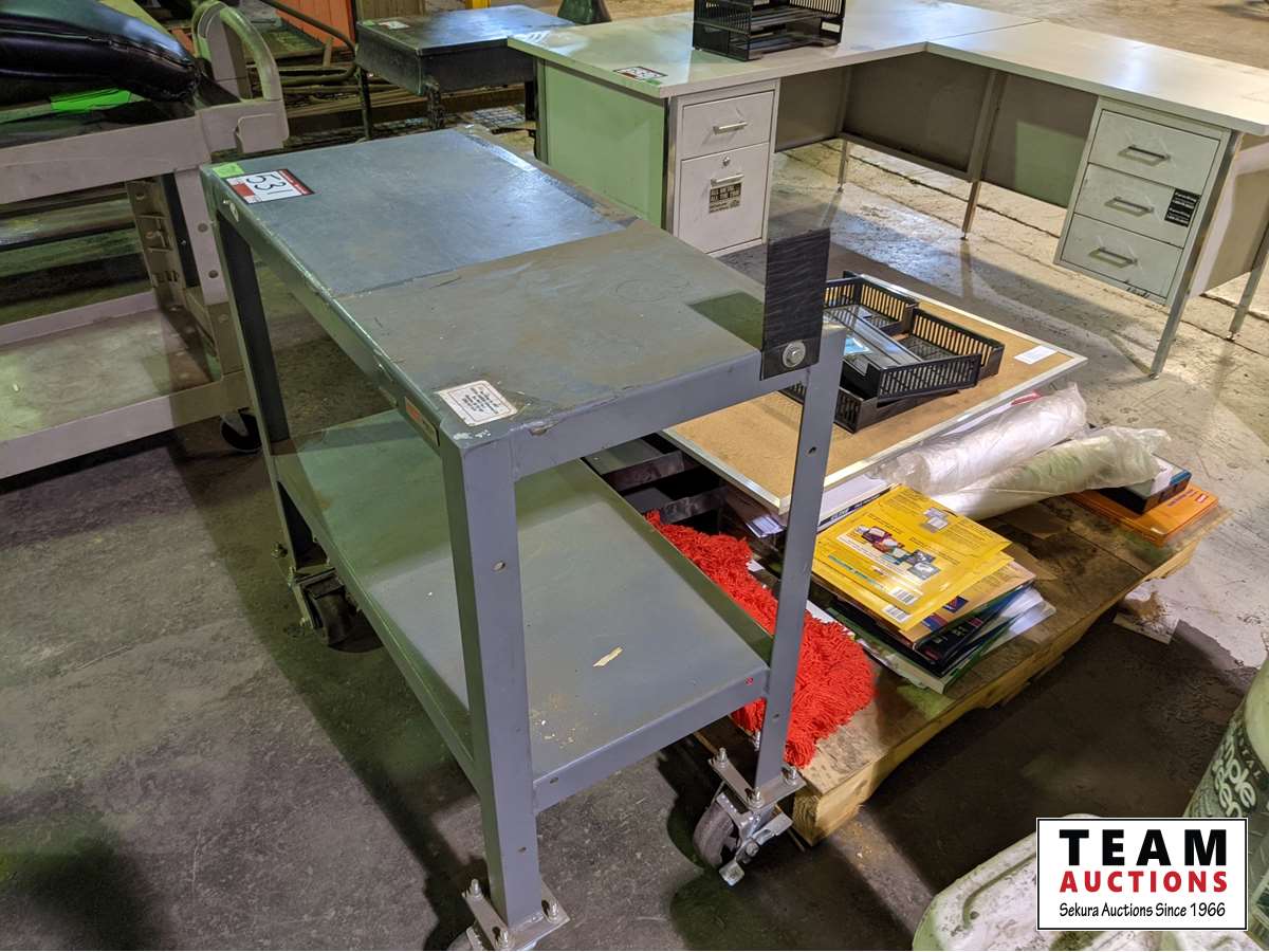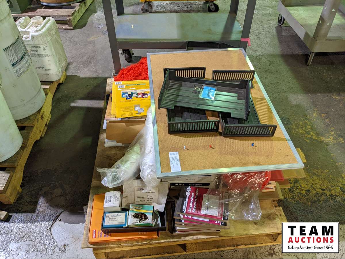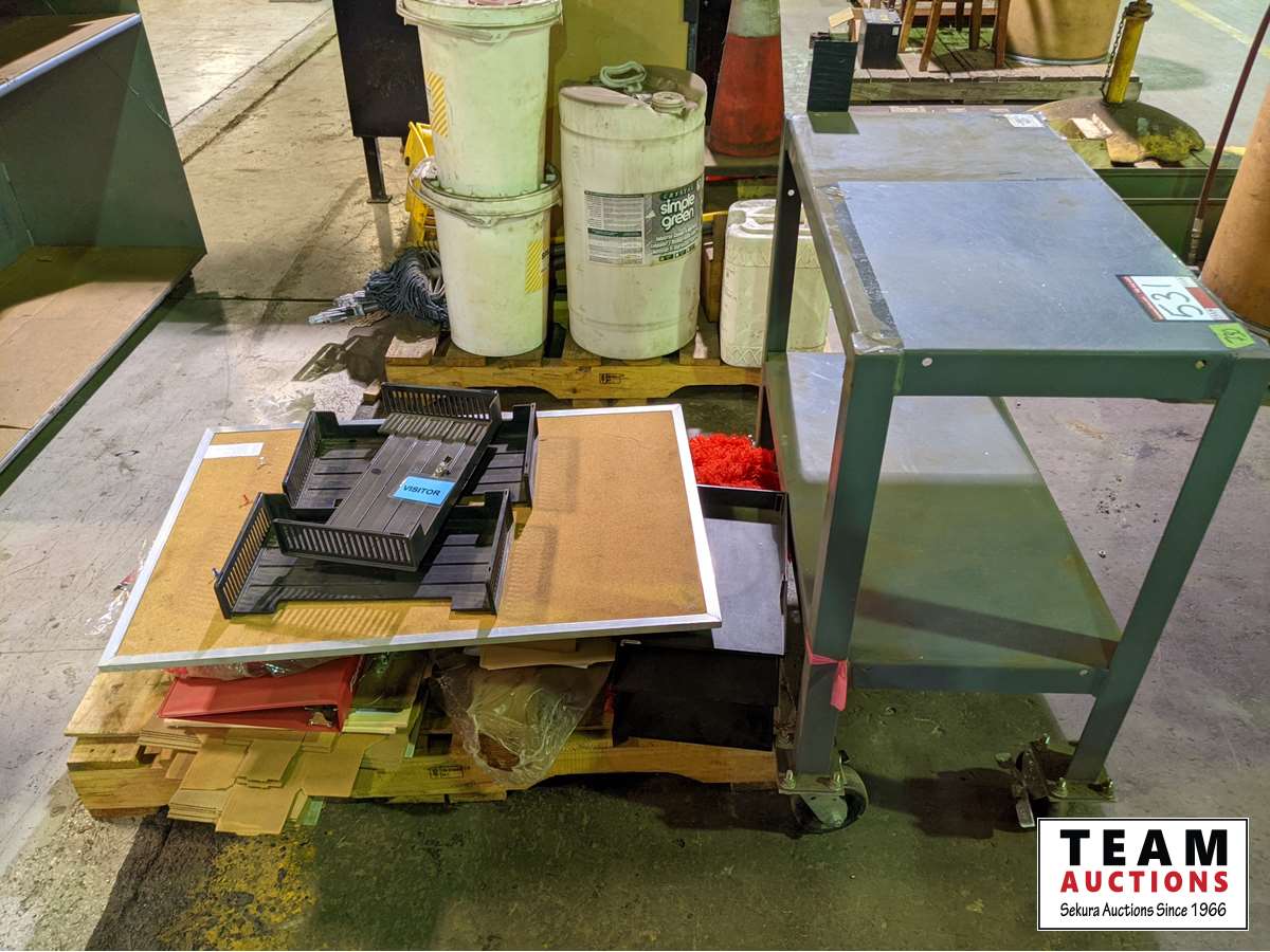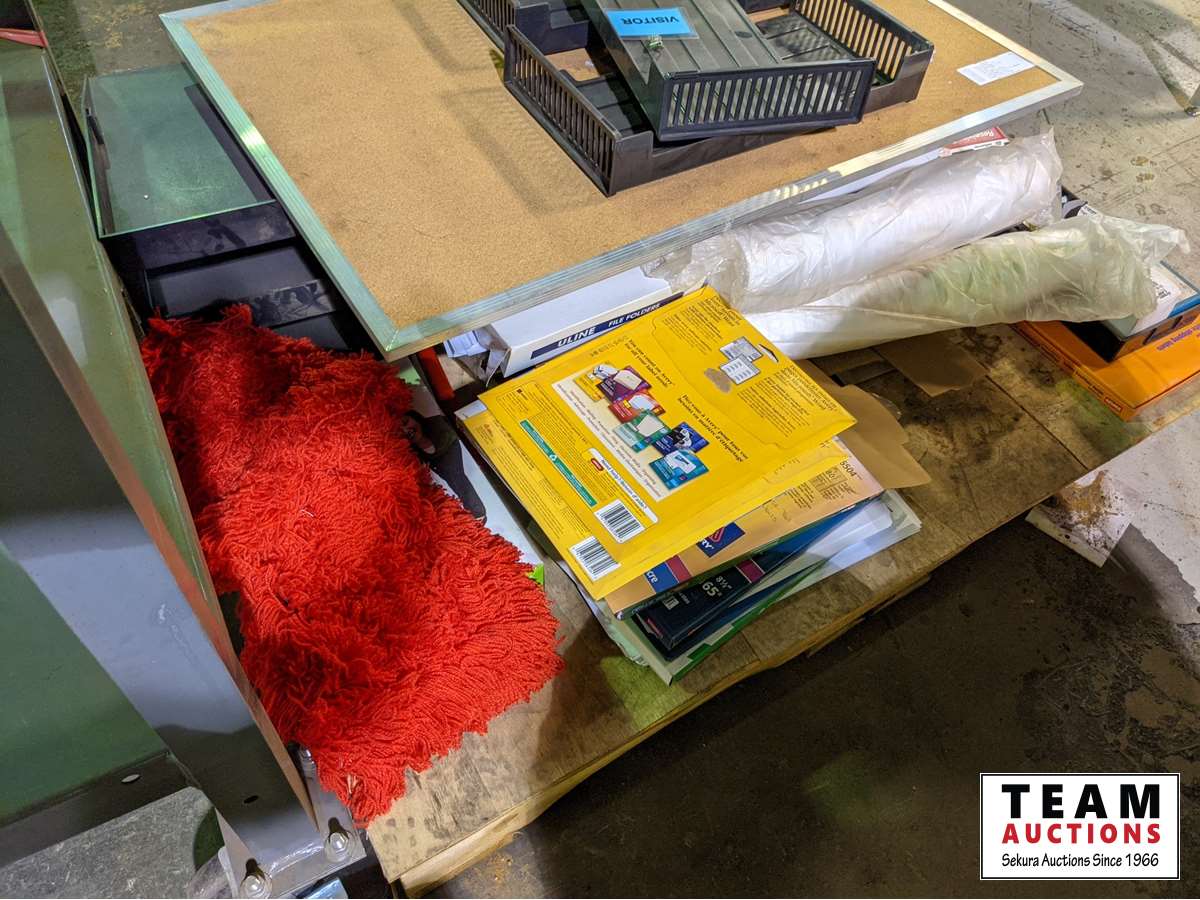 Miscellaneous office supplies, peg board, shipping labels, file holders, mop, cart is 18 inch wide X 36 inch long X 36 inch high