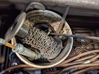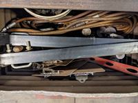 Miscellaneous tools, squares, oil cans, large pipe wrench, tape measures