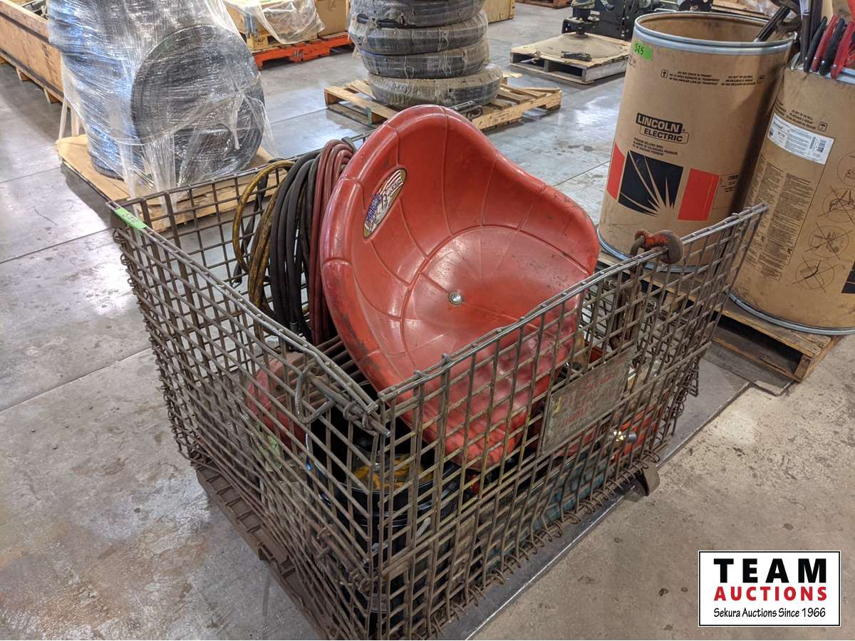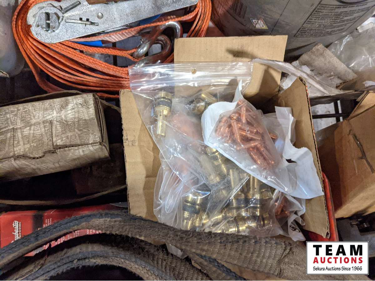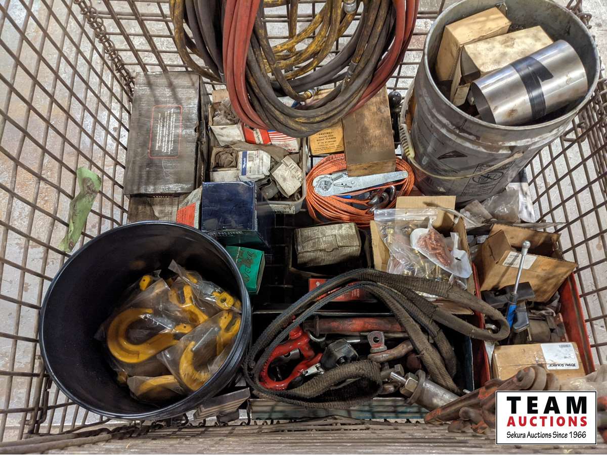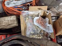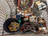 Air hose, mechanics stool, load binder, ratchet straps, hooks, pins, shackles, mig welder tips, miscellaneous parts