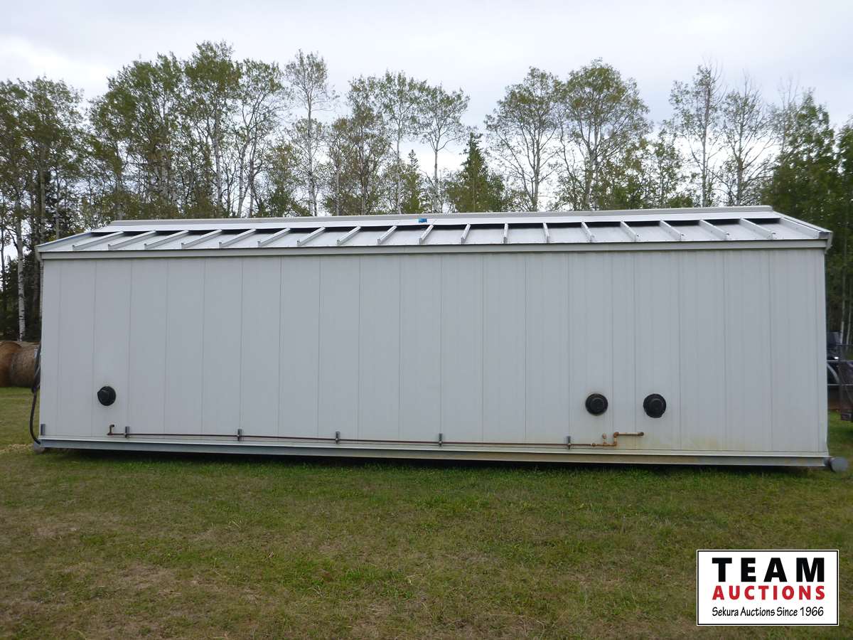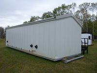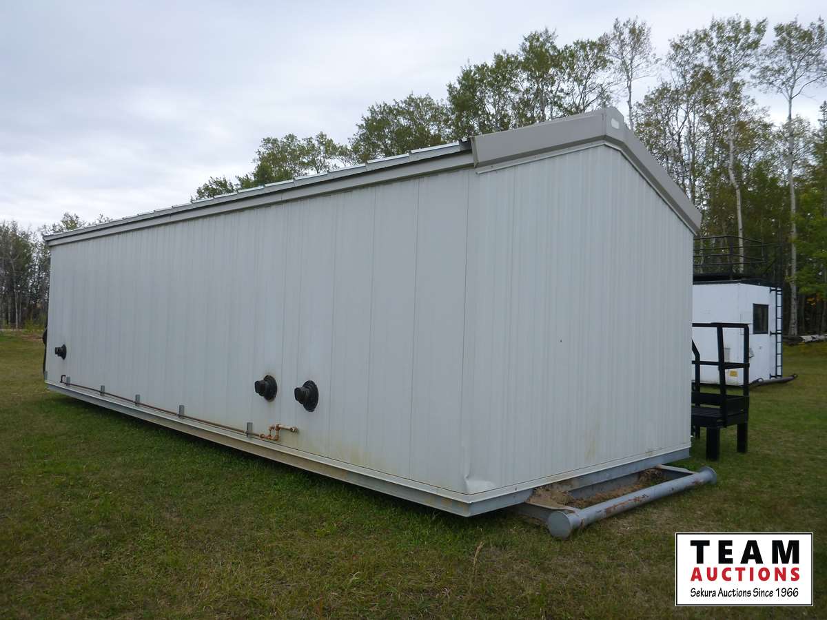 All steel construction with no wood, mounted on steel, skids, (3) gas furnaces, (2) rooms, bathroom, hot water tank, (2) side door entrance, out side steel custom build metal decks