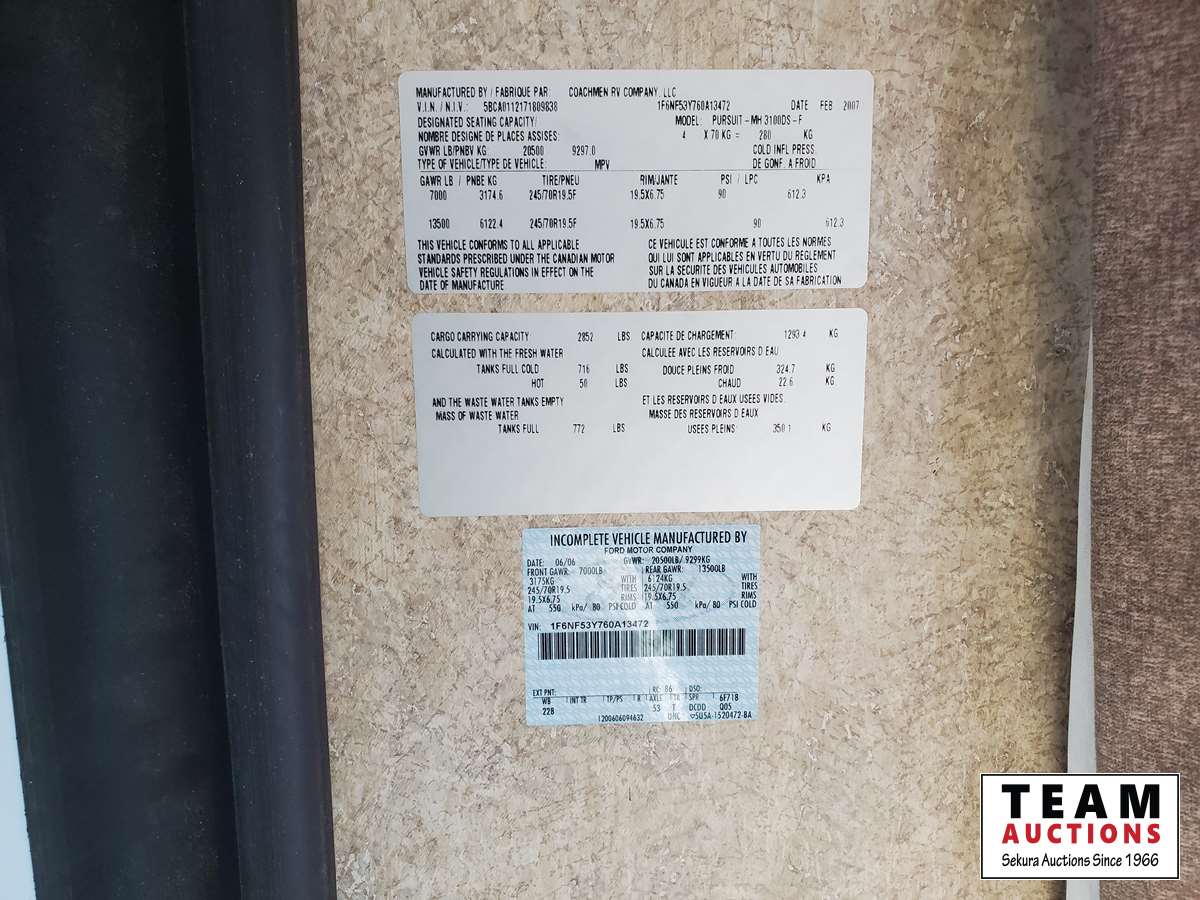 2006 Ford Chassis sn 1F6NFSBY760A13472, propane, automatic transmission, A/R suspension, 7000 lb front, 13500 lb rear, 228 inch WB, 2 slides, A/C, Onan 5500 Marquis Gold generator, 74 hrs, 2006 Ford Chassis 1F6NFSBY760A13472
