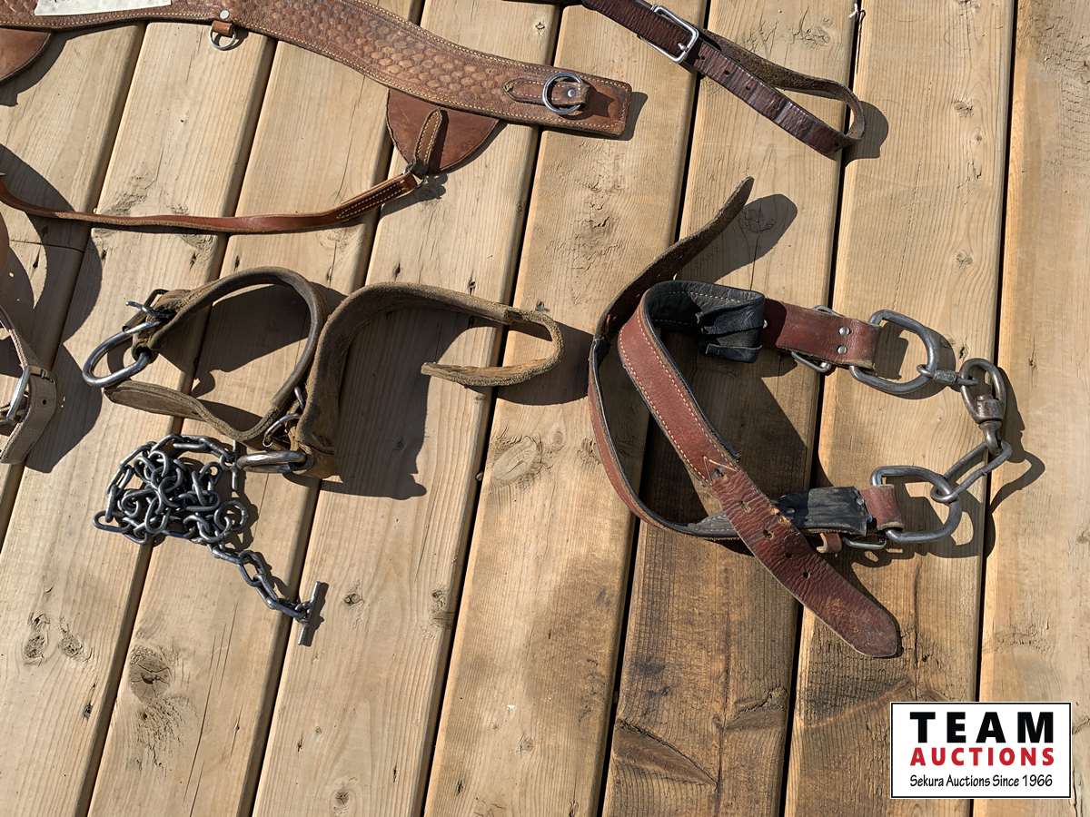 (2) sets of leather hobbles, bells, set of chain hobbles & (2) breast collars