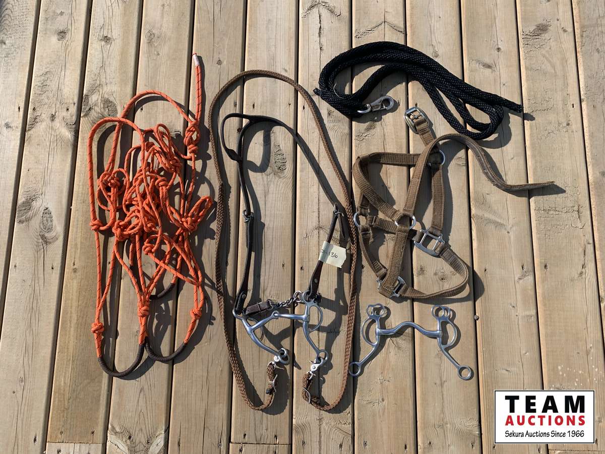 (4) Halters (3 rope ones), headstall complete with bit and reins, lead rope & (1) curb bit