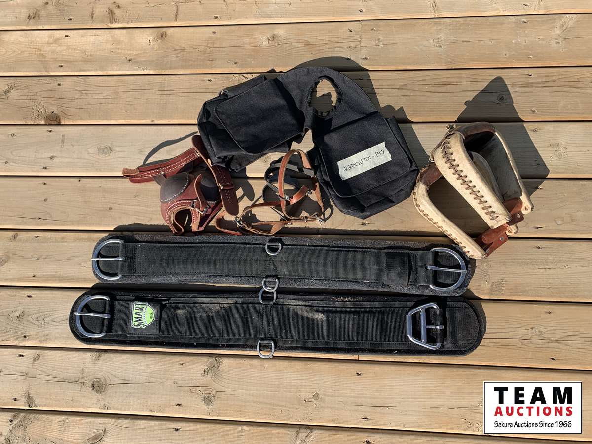 (2) 34 inch cinch, saddle bag, set of stirrups, set of boots