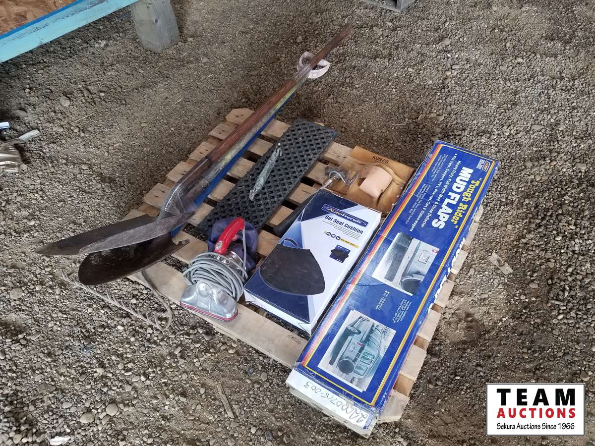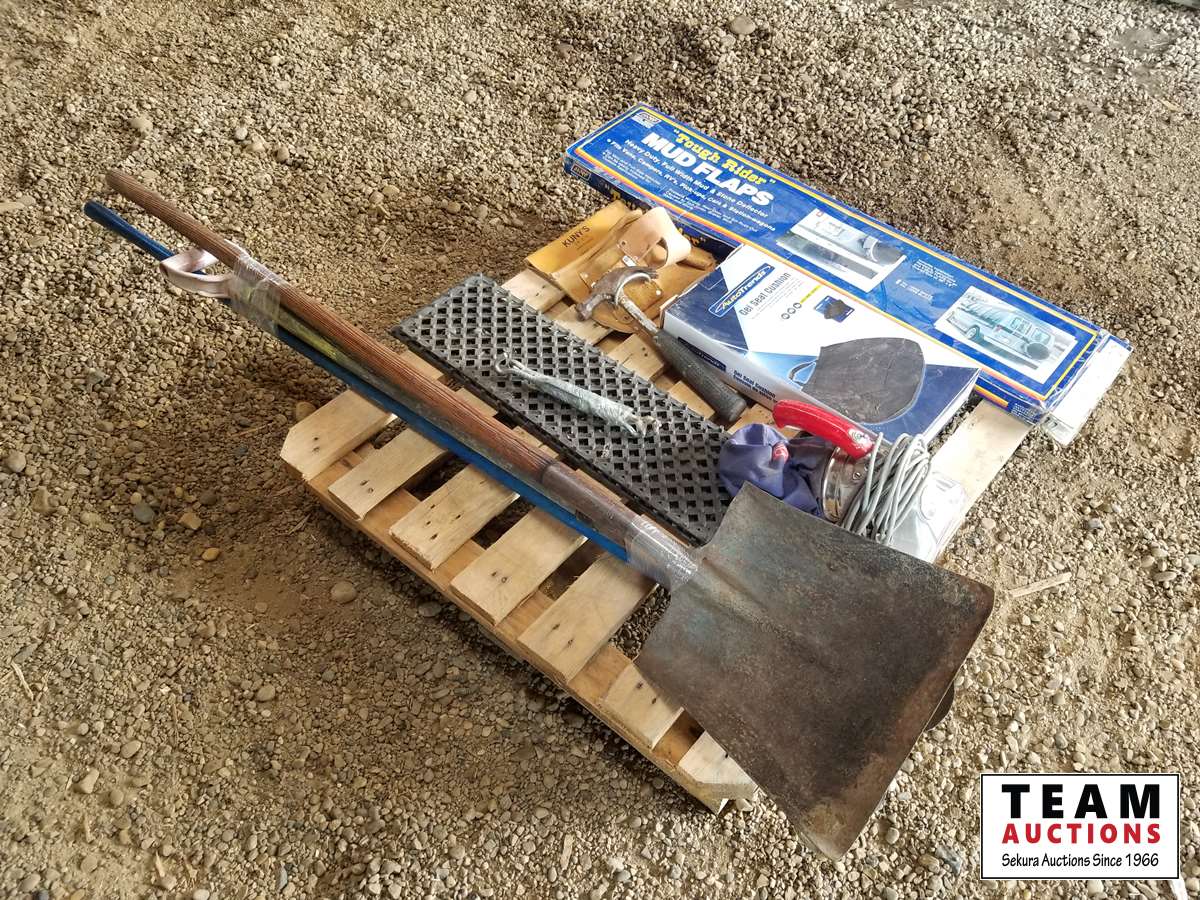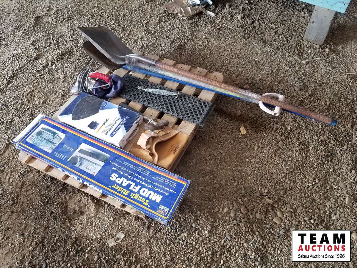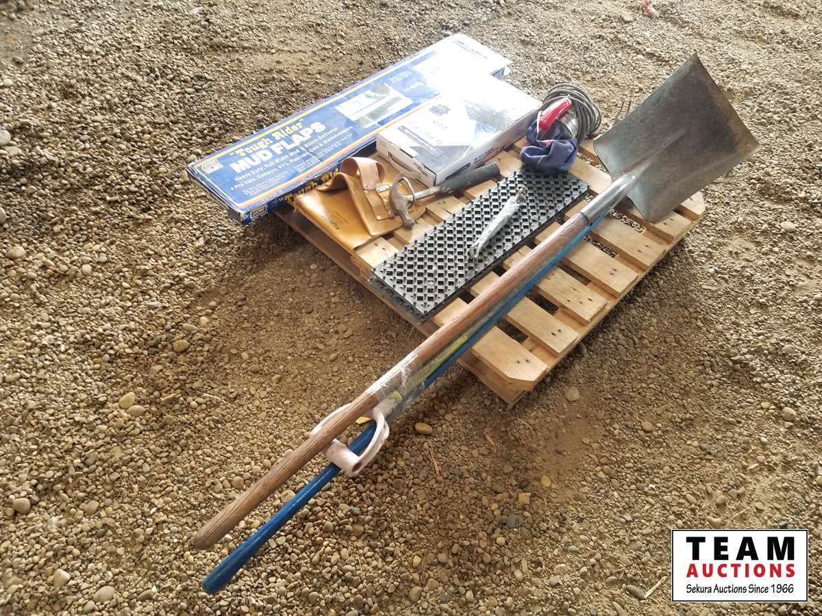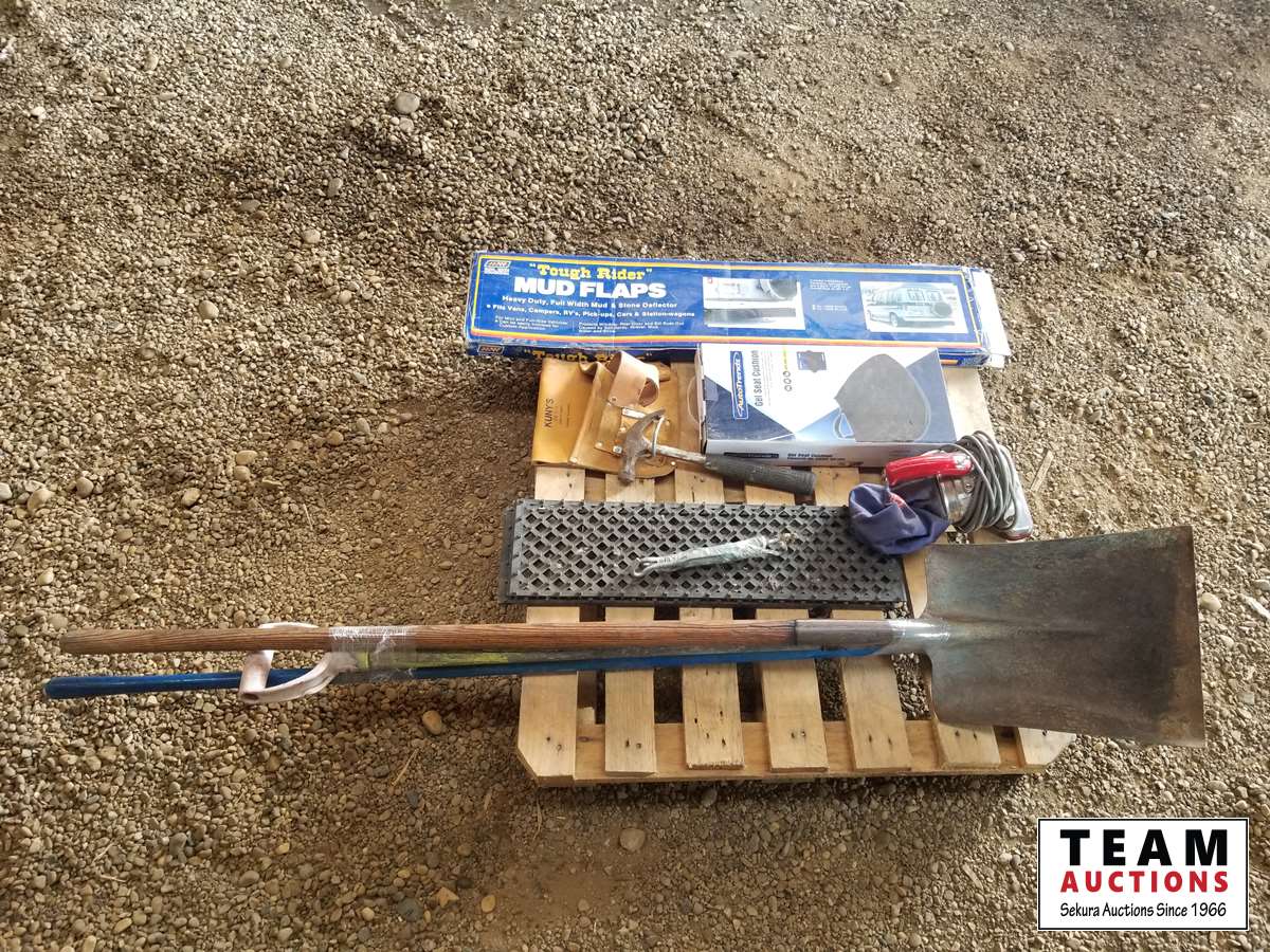 Mud flaps, gel seat cushion, shovels, rake, hammer & miscellaneous