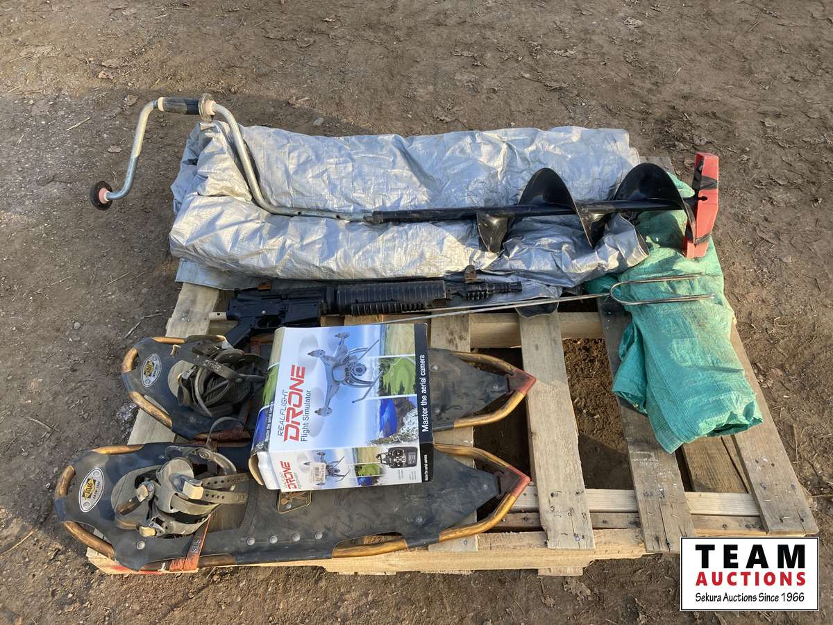 Tarps, ice auger, soft air gun, weiner sticks, snowshoes, drone, simulator
