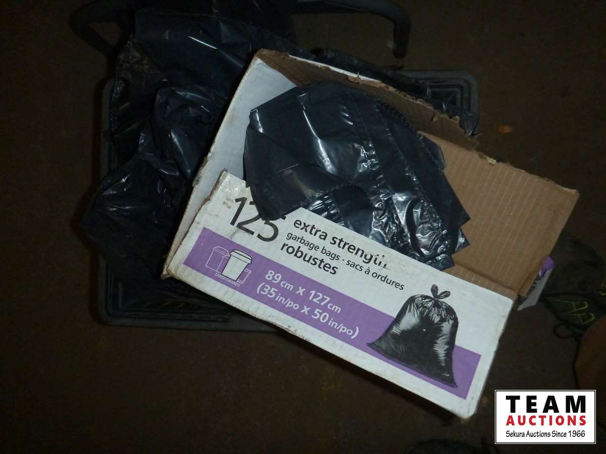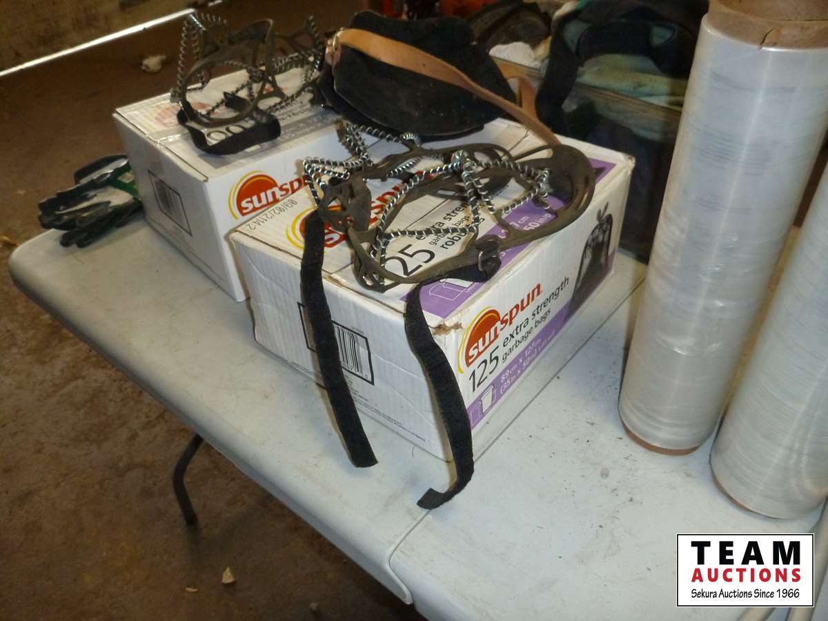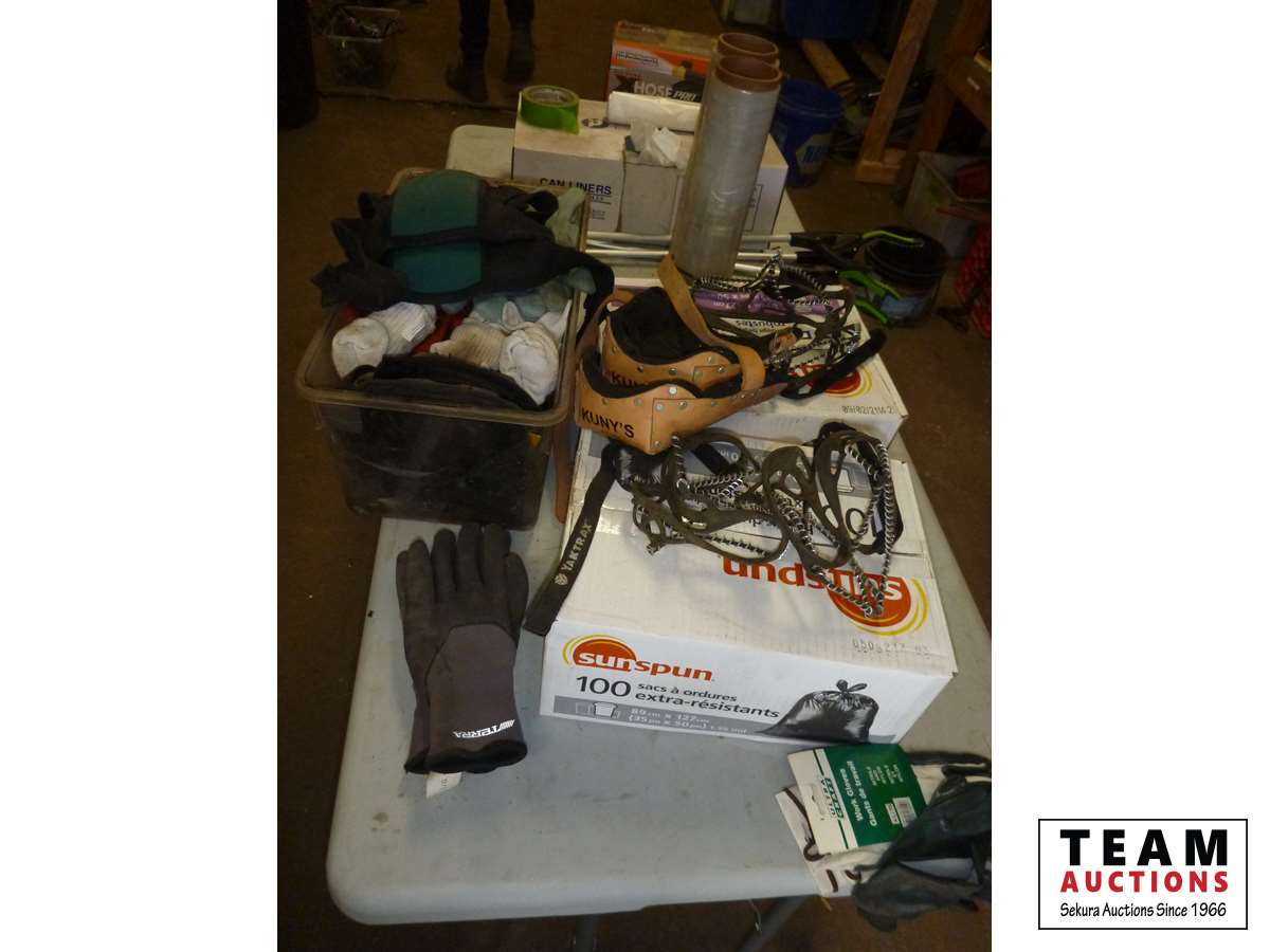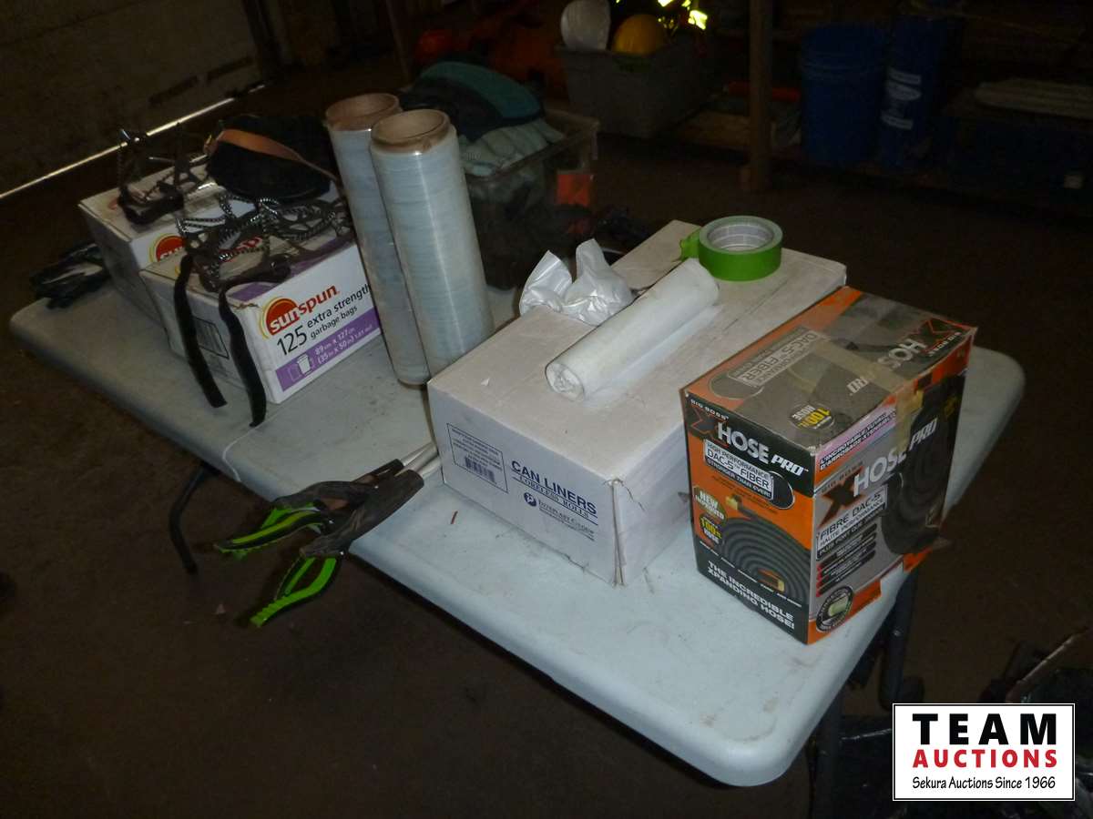 100 ft soaker hose, (2) boxes of large garbage bags, knee pads, boot ice cleats, garbage picking tools, work gloves, (1) tote of large garbage bags