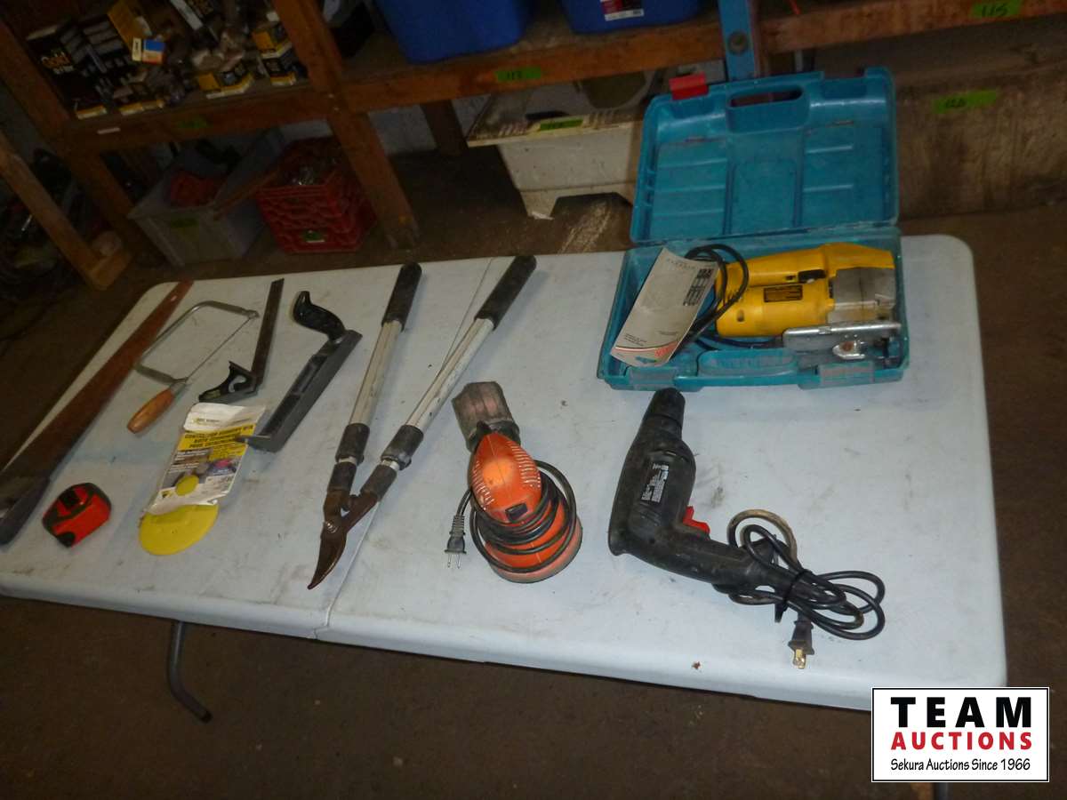 Coping saw, drywall rasp, square, tape measure, B&D palm sander, Jobmate drill, pruning lopper, DeWalt jigsaw