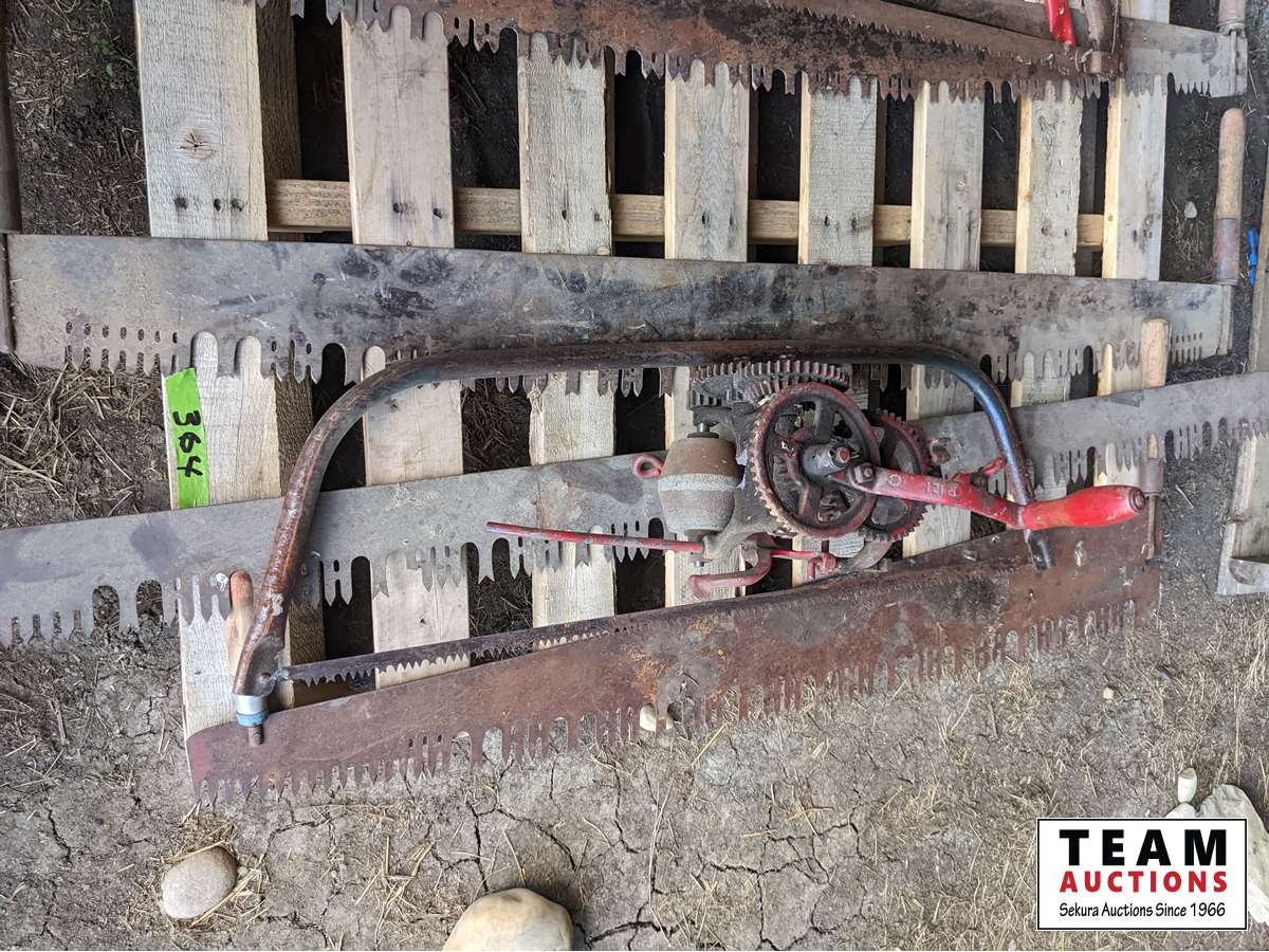 42 (3) Cross Cut Saws, (1) Bow Saw & Hand Crank Sickle Sharpener