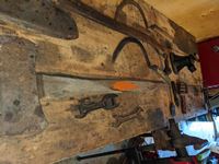 Broad axe, double head axe, small screw jack, wrenches, leg vise, miscellaneous
