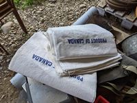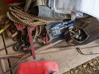 Roll roof wrap, machine bushings, (2) weigh scales, rope wire stretcher, sacks, tool box, Jerry can, miscellaneous