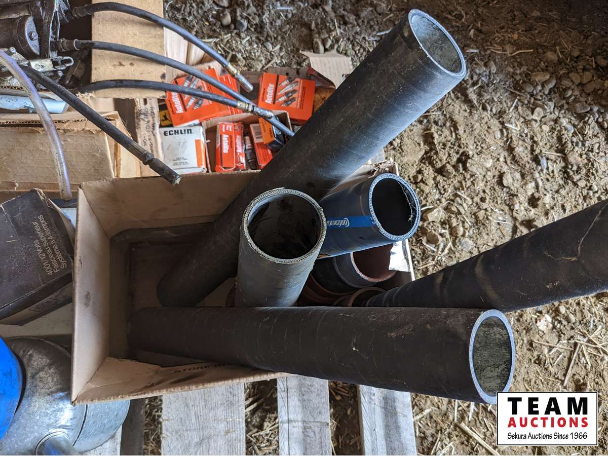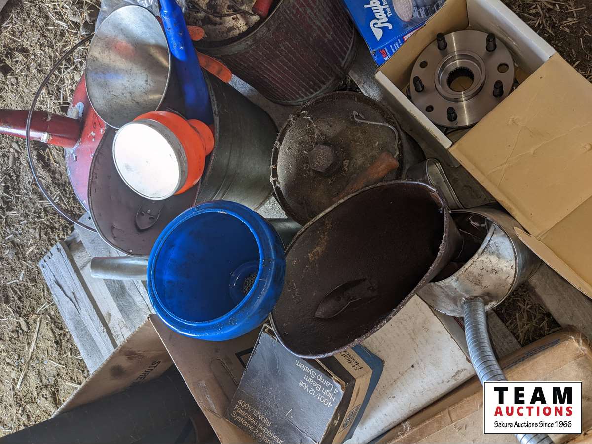 Rad hoses, spark plugs, gas cans, oil cans, funnels, new implement jack, new hub, brake pads, miscellaneous