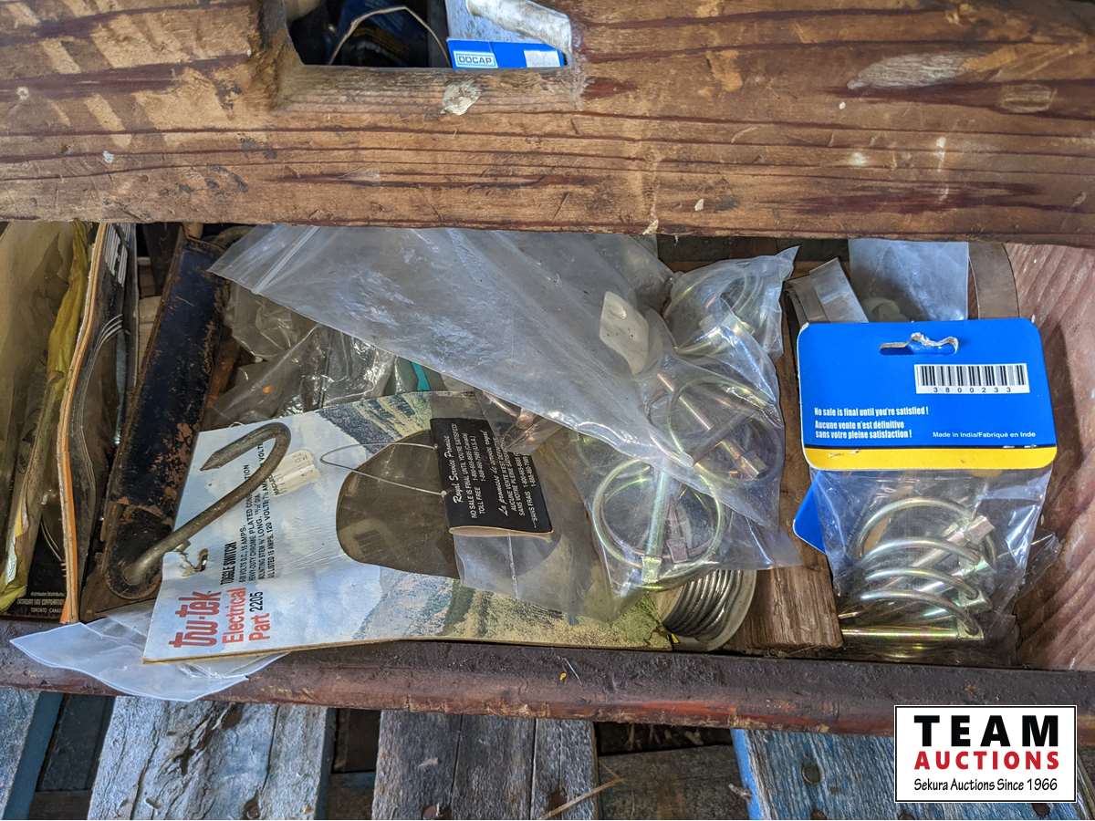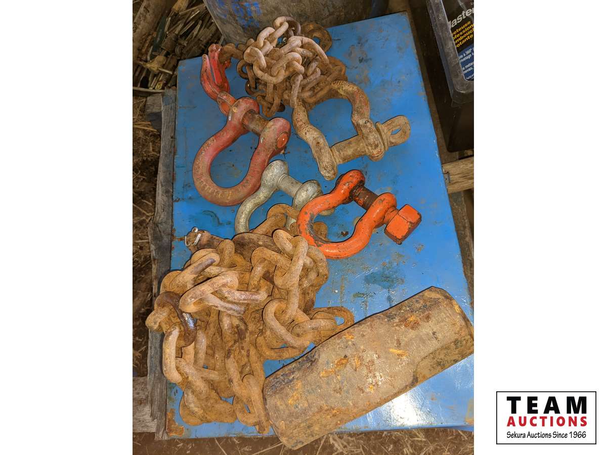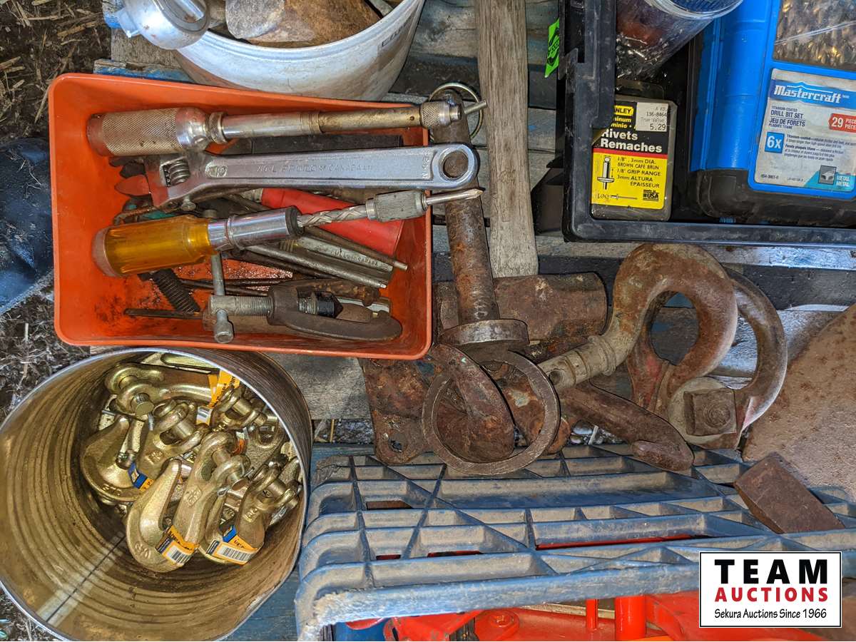 Chain hooks, files, shackles, hand tools, drill bits, Shop Built stool, miscellaneous hardware