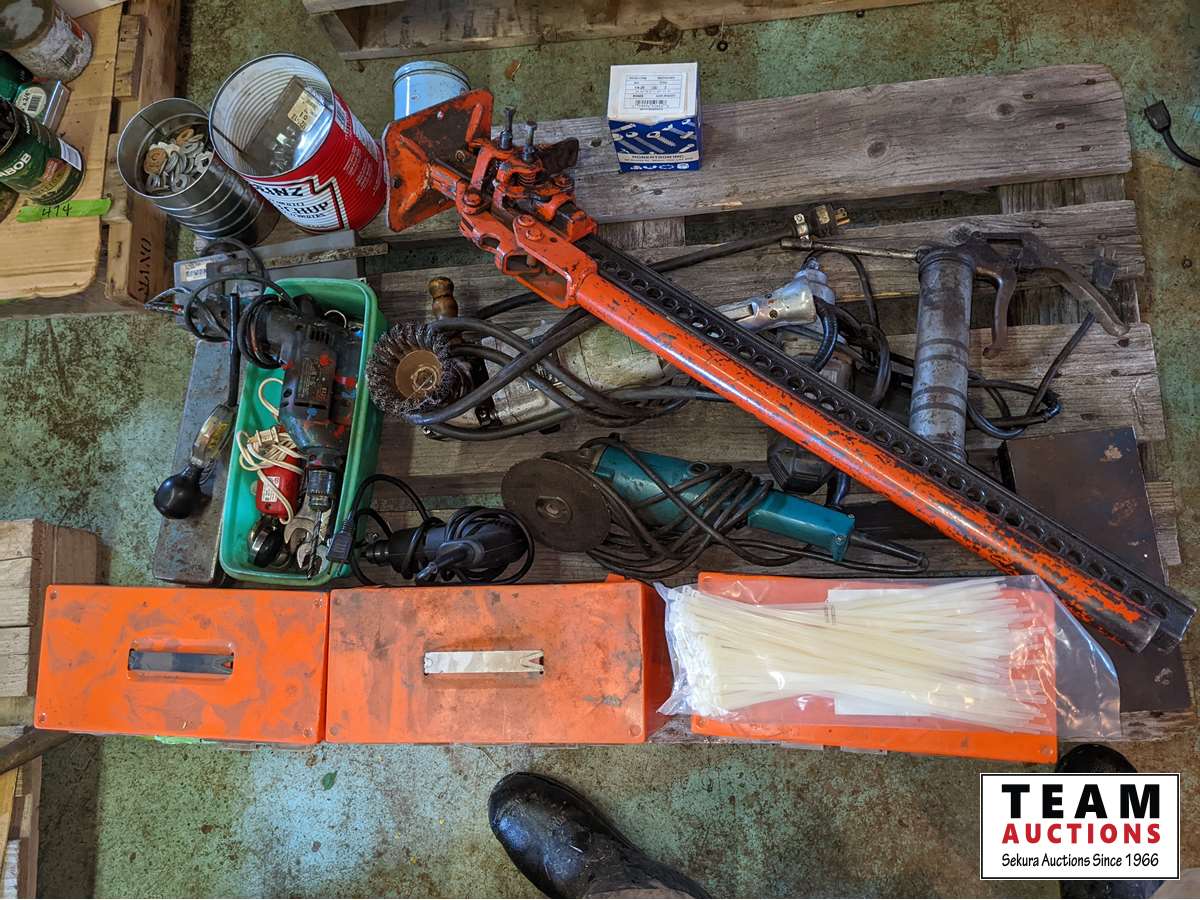 Jack All, angle grinder, (3) assortment cabinets, (2) corded drills, 1/2 inch impact, miscellaneous