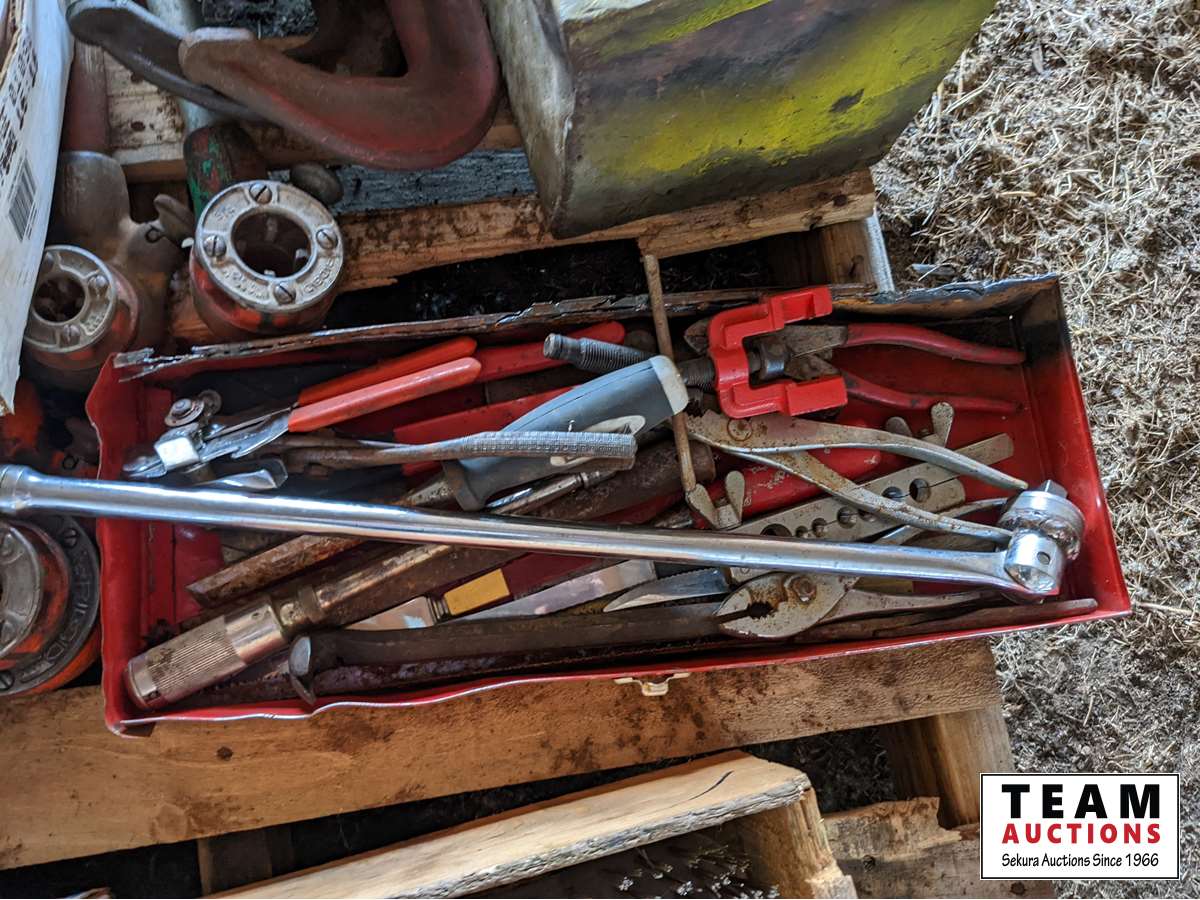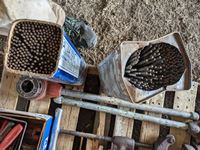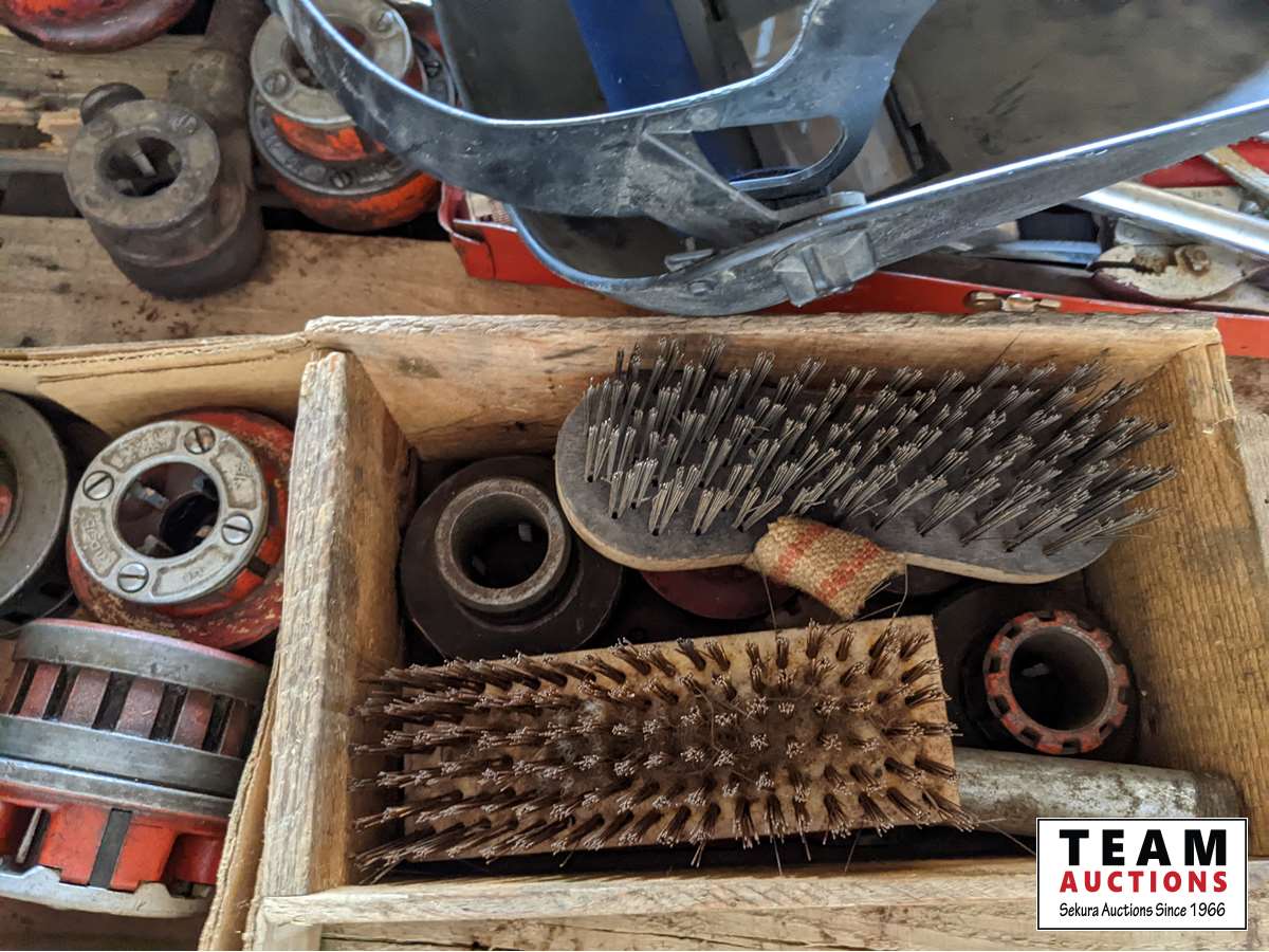 Welding rods, welding helmet, pipe dies with handles, pipe vise, miscellaneous