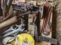 Slings, ratchet straps, load binders, chains, pipe wrenches, Jack All, receiver hitches, (2) bottle jacks, miscellaneous items
