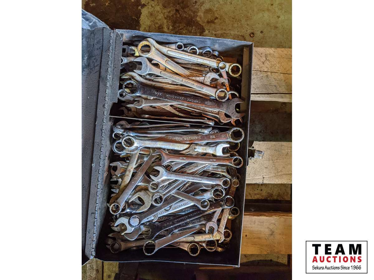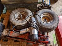 Small floor jack, (2) small cart wheels, 3/4 ft electric impact, wrenches, pullers, (2) tool boxes with tools, Allen wrenches, (2) Tap & Die sets, miscellaneous tools