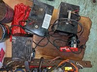 Grease tubes, (3) small chargers, drill, trouble light, hardware, 14 inch chop saw, miscellaneous items
