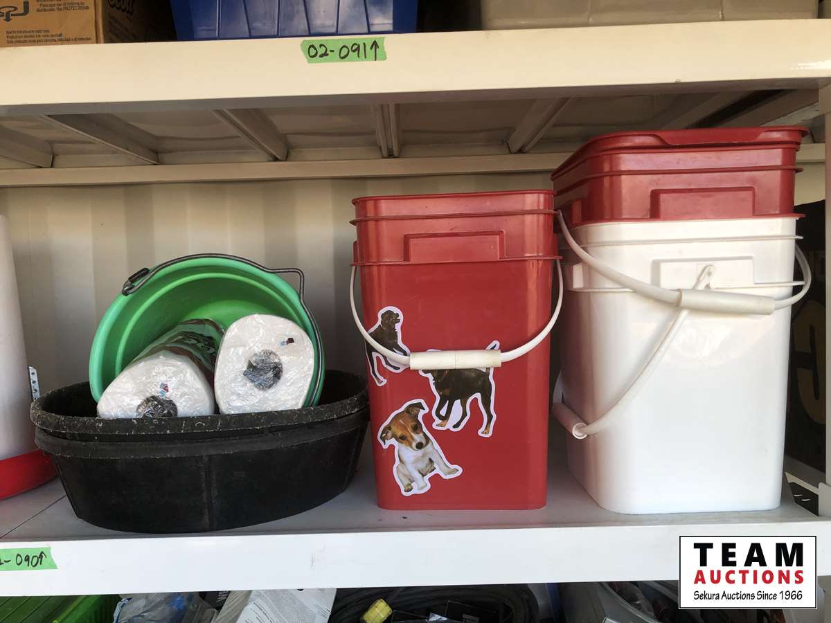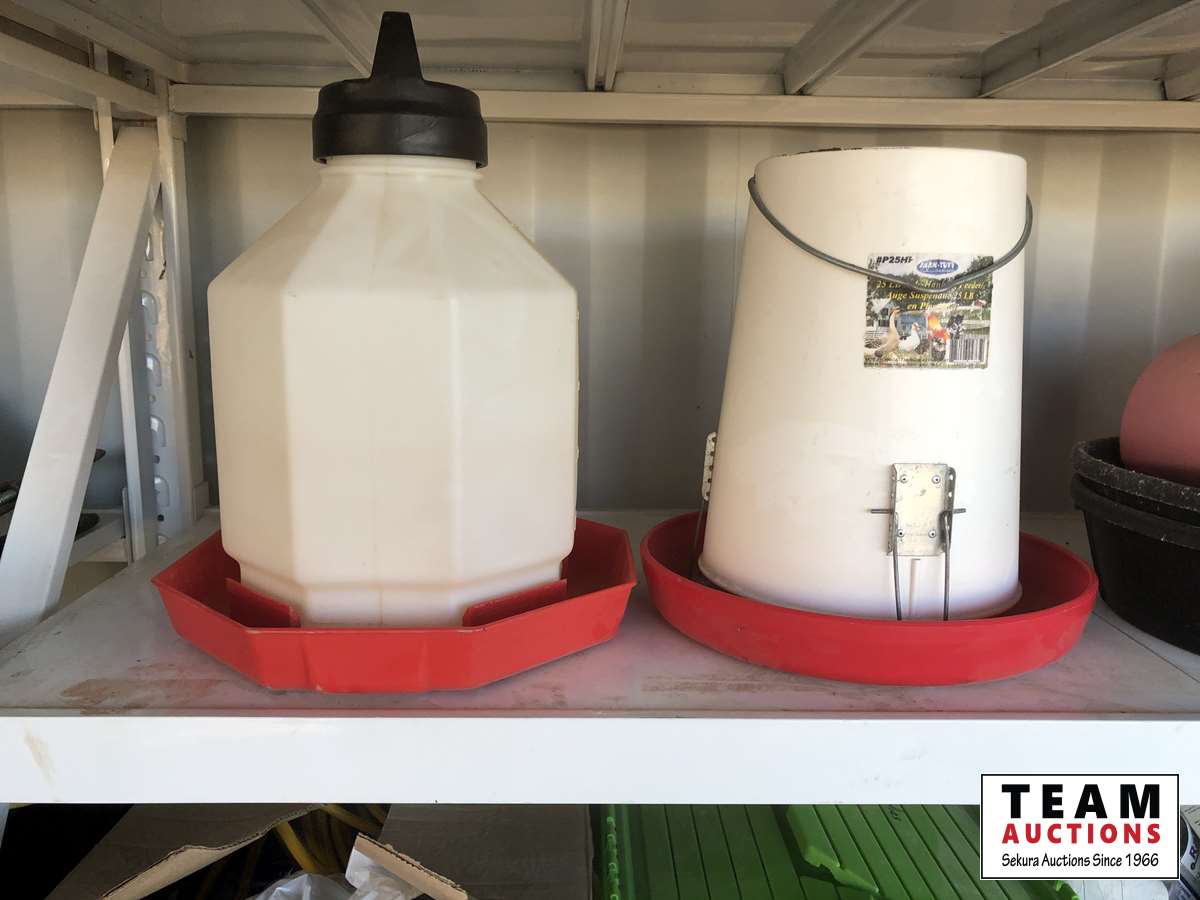 (3) pails, (2) rubber feed bowls, (2) feed buckets, (3) heated water bowls, (2) chicken feeders, heat lamps, miscellaneous